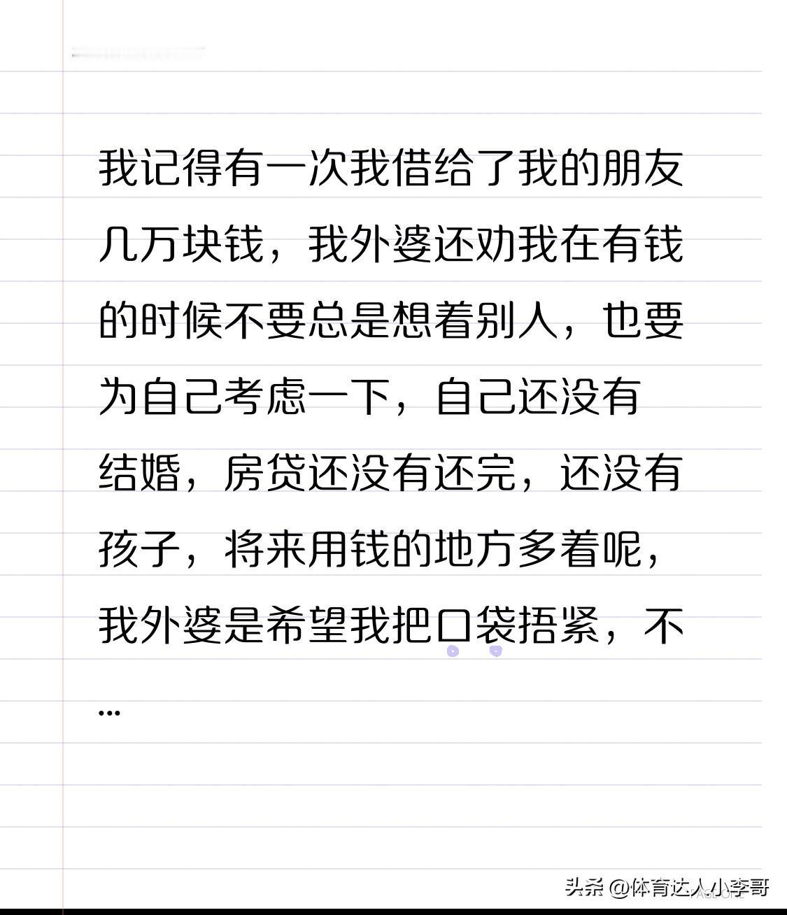 我记得有一次我借给了我的朋友几万块钱,我外婆还劝我在有钱的时候不要总是想着别人,也要为自己考虑一下,自己还没有结婚,房贷还没有还完,还没有孩子,将来用钱的地方多着呢,我外婆是希望我把口袋捂紧,不要总是把钱借给别人,到最后想要回来的时候就很难。因为我外公当时因为疾病,后来还坐了轮椅,向以前借的钱的人去要钱,对方死活不给,我外公都那样了,对方还是不给,然后我外婆就说一定要捂紧自己的口袋,我当时还不以为然,直到后来我妈告诉我,有的农村人可能一年也赚不了1万块钱,一年也花不了几千块钱,那时候我才明白,原来钱有这么多的购买力,在35岁之前的话,对钱没有概念,总觉得有钱就花掉呗,而35岁之后的话,我开始觉得有钱就意味着底气,钱意味着实力,钱能够让我产生非常稳定的内核力,遇事不慌张,钱意味着成年人的尊严!