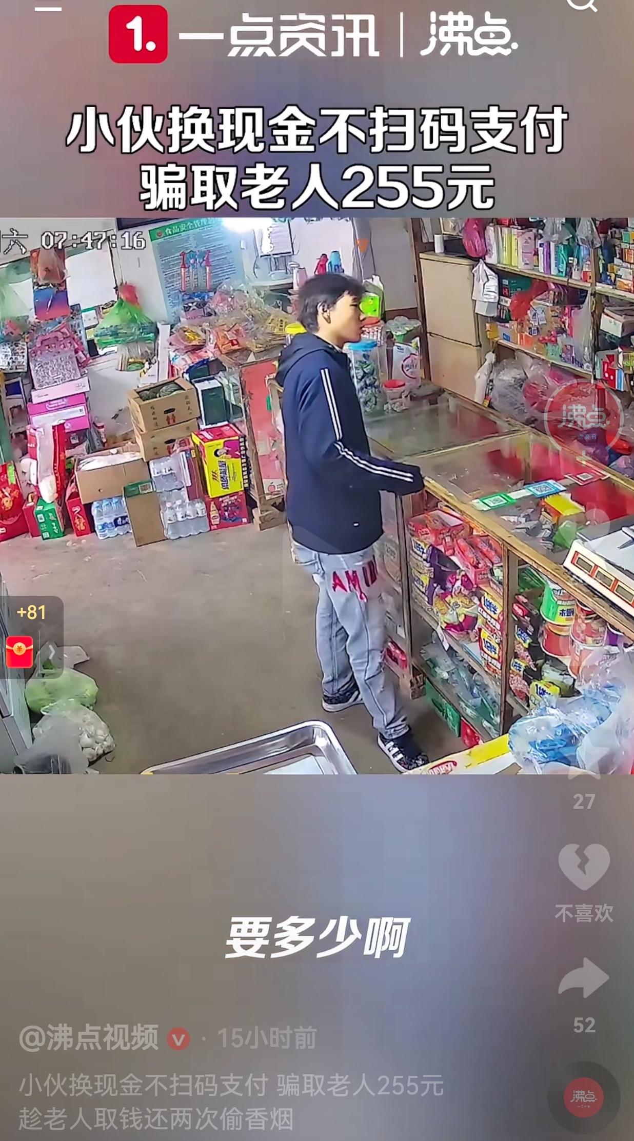 丢人丢大了!近日,河北廊坊一小伙来小卖部换现金,小伙跟老人说,我想换255块钱。老人也很热情,直接答应了小伙子的要求。 谁知道当老人转身刚要取现金的时候,小伙子不讲武德,隔着柜台,想要盗取香烟,由于距离太远,尝试了两次,都没有成功。 等老人把钱取回来给小伙子的时候,小伙子装模作样的说:“奶奶,我给你转260块钱吧!多给你转5块钱。” 老人还说,不用多给钱,只要我有钱,无论是谁,我都会伸出援助之手。这又不是什么大事,都是小事。 结果小伙子扫了柜台上的二维码然后,就往外走。小伙子说我转过去了,说着说着,就离开了。 但是,老人一直没有听到微信收款的声音,有点警觉,就对小伙子说:“你是微信付款吗?怎么没有听到声音吗?” 小伙子没有说话,这个时候就悄悄溜走了。 老人这才意识到自己被骗了,本来还没有那么生气,想着也就255块钱。结果,一查监控,老人气坏了! 因为,小伙子想偷她家的烟,这还了得,老人一气之下就选择了报警,目前警方正在处理此事。 网友看到后评论说,监控下拍的清清楚楚,这下丢人丢大了,年龄这么小,就干这种事情,也不知道丢人二字怎么写? 还有的网友说,胆子真够大的,难道不知道监控无处不在吗? 年纪轻轻的,做点啥事不好?为什么非要选择偷盗呢?这下好了全网都记住你的模样了,如果被人认出来,下次怎么还有脸出来混呢? 大家觉得呢?欢迎大家评论区讨论留言。