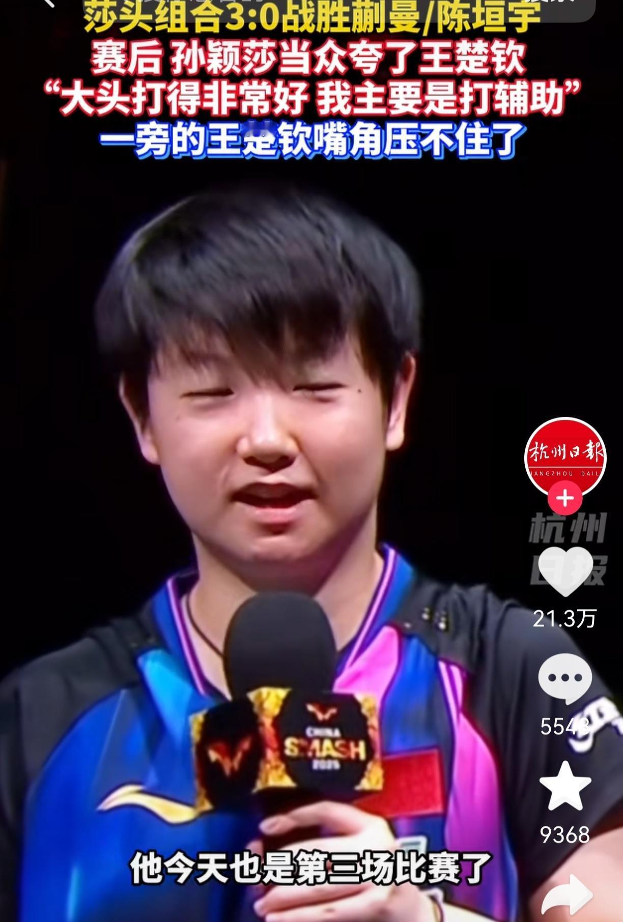 王楚钦说, 没人想问下莎莎吗? 莎莎刚还低头偷着乐呢,听见这话猛抬头。 她今天采访里净夸大头了,说他打了三场比赛状态越打越开,自己就负责辅助让他多得分,说得大头一脸灿烂笑。 大头自己也说,国庆当天赢三场特别开心,祝祖国生日快乐,还想后面多打精彩比赛。 这俩人一个夸得实在,一个说得真诚,场边氛围热得能化了。 你说这搭档处得,一个愿夸一个愿听,怎么能不让人跟着乐呢?