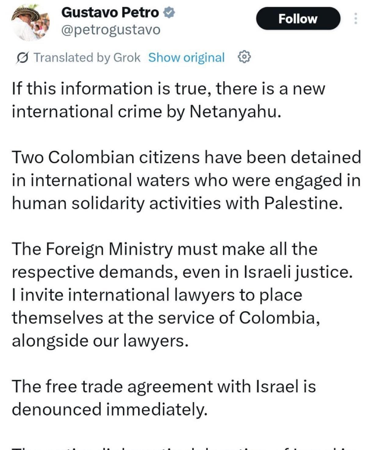 在前往加沙的苏姆德船队被拦截后,哥伦比亚总统将所有以色列外交官驱逐出境。 佩特罗称,以色列海军扣押了两名其公民的船队船员 “立即谴责与以色列的自由贸易协定”