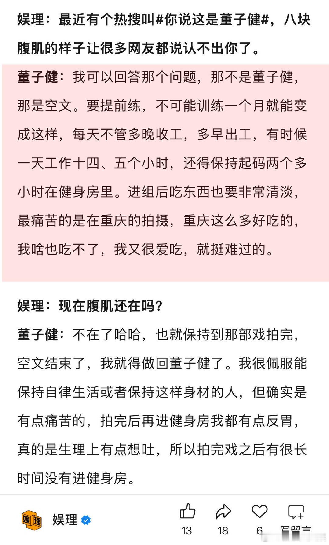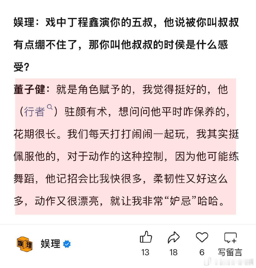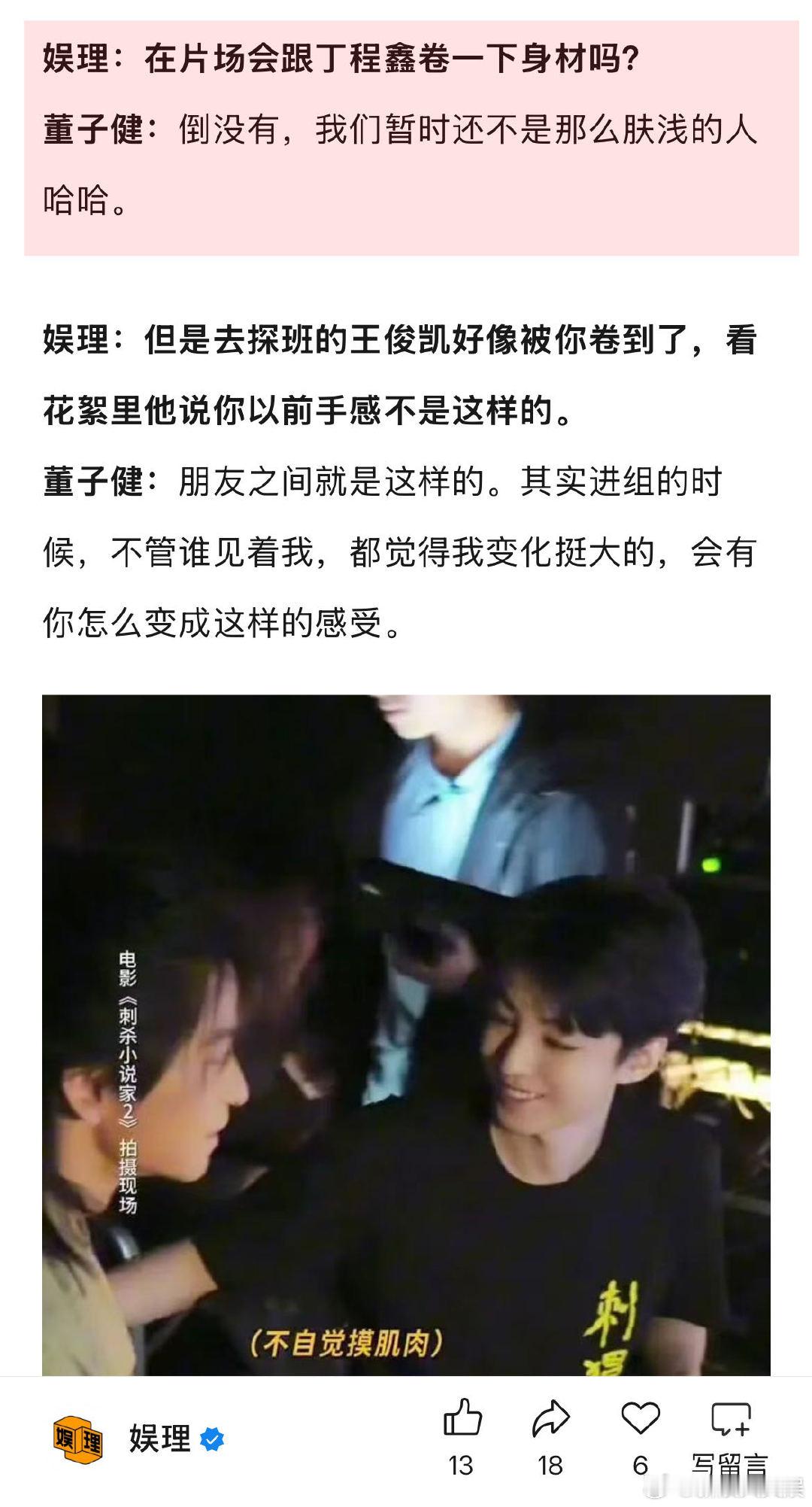 董子健说挺佩服丁程鑫的 董子健说演张震儿子压力非常大 董子健称八块腹肌是空文的,透露为了身材最难过的就在重庆拍摄时,很多好吃的都吃不了。谈及是否有和丁程鑫一起卷身材,他直言没有,“我们暂时还不是那么肤浅的人哈哈。”谈及王俊凯说他手感不一样,董子健表示“进组的时候,不管谁见着我,都觉得我变化挺大的…”娱理独家↓