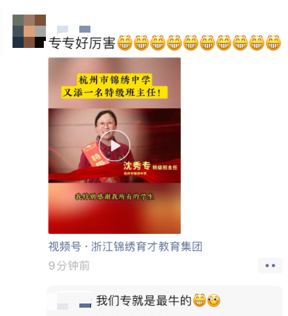 沈老师很谦虚,说自己也没想到,会被评上特级班主任。但朋友圈里,这个消息已经刷屏了,很多毕业生在转发。一位同学转发时说:“我们最好的‘专专’!”“秀秀”和“专专”,都是大家对于沈老师的昵称。