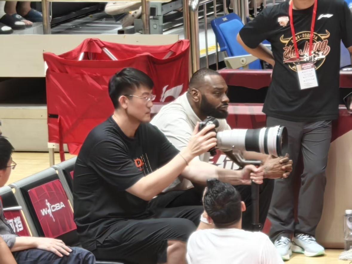广厦主帅王博从热身赛看台移至场边,手持相机拍照记录