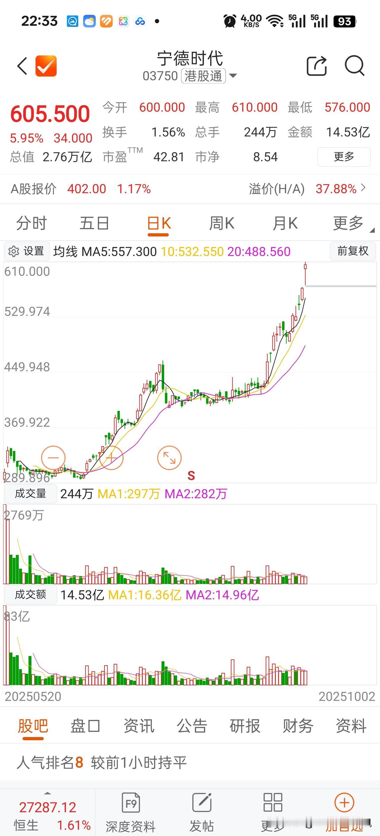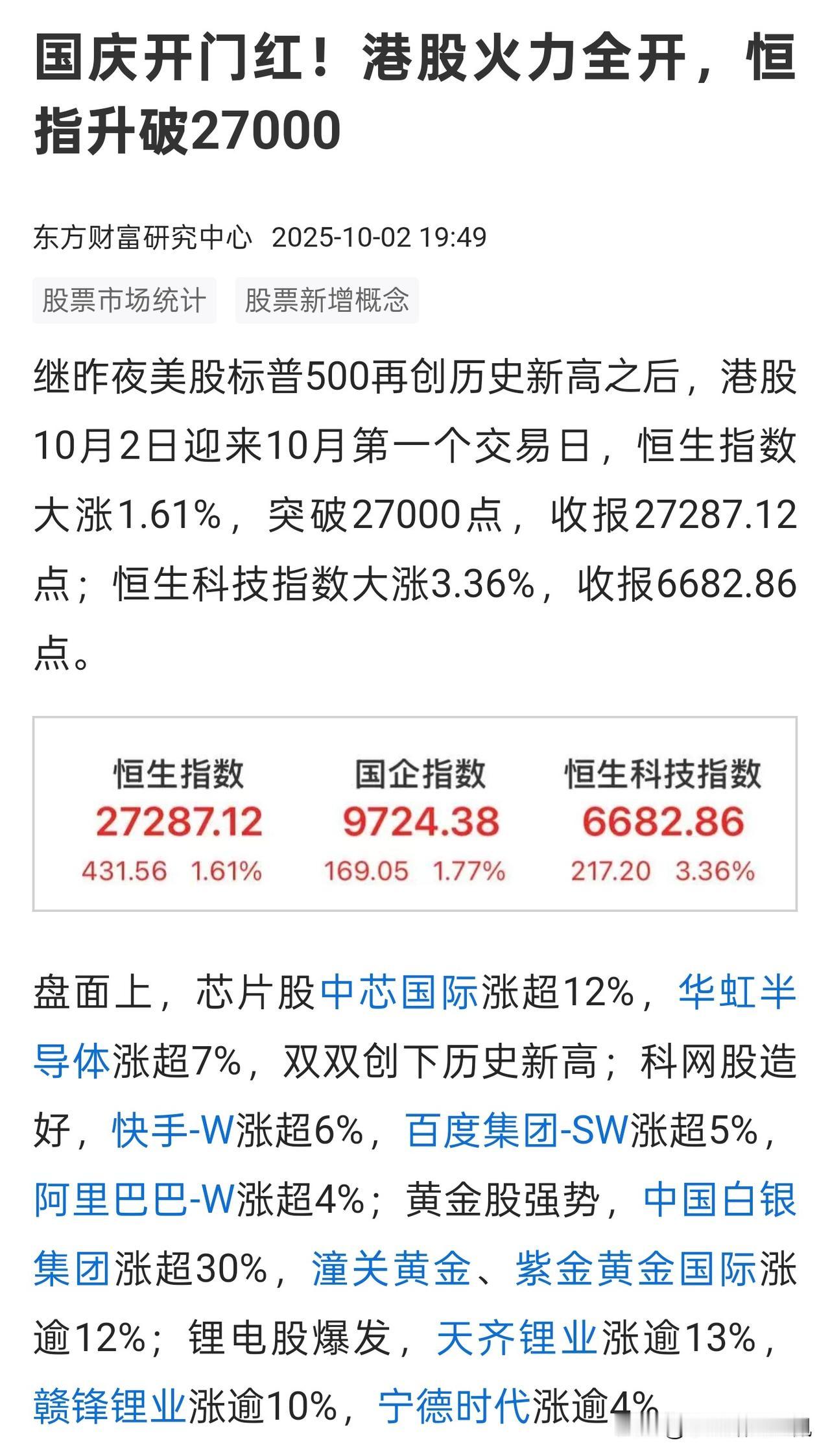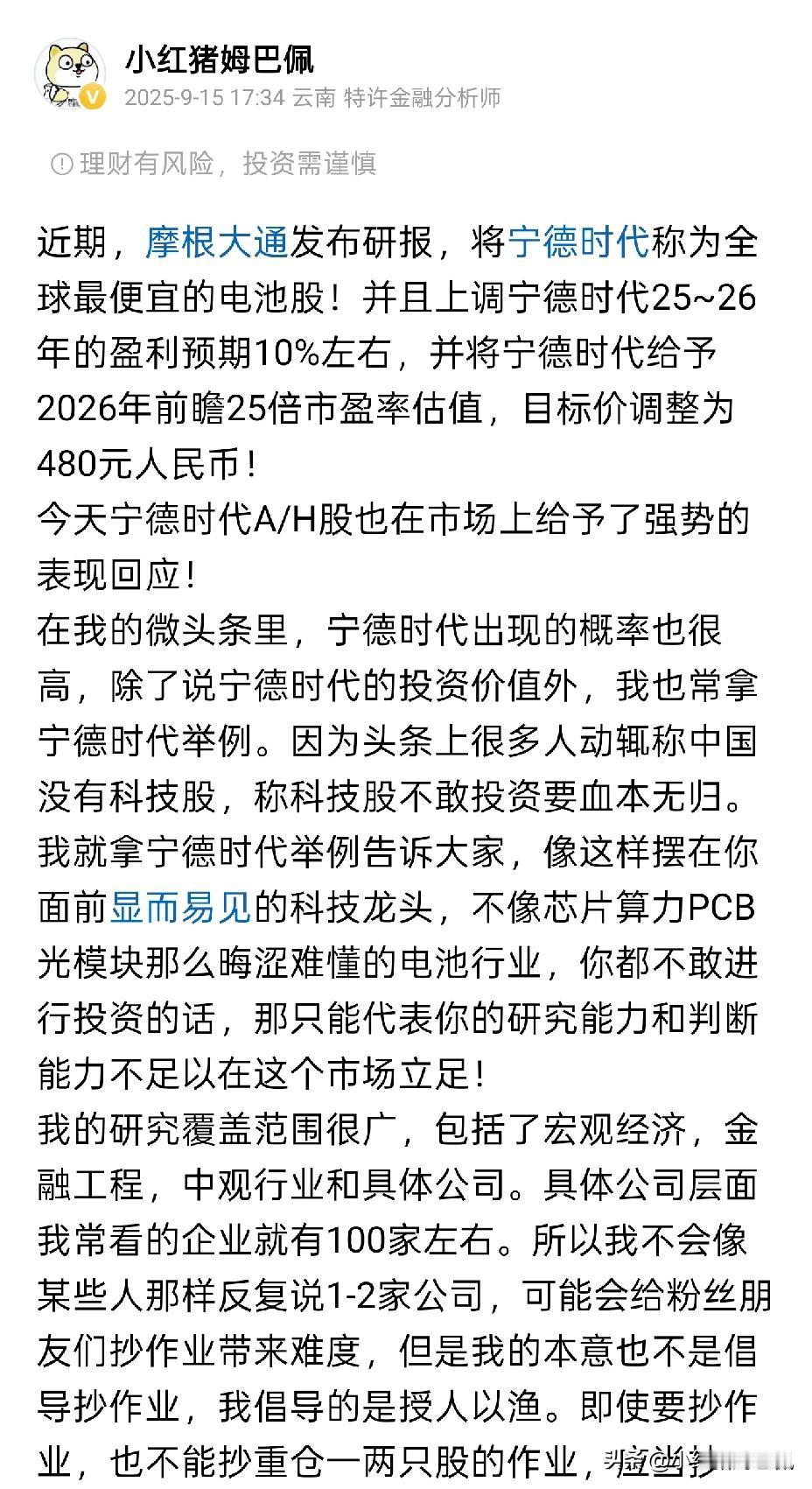 今天港股迎来了国庆后的第1个交易日,在国庆前我早就说过可以通过长假期间观察港股的表现,看一看纯境外资金对于中国资产的一些态度。 今天恒生科技依然大涨3%以上,中芯国际涨幅达到12%,宁德时代涨幅超5%。充分体现了外资对于中国科技企业,算力、科技互联网以及新能源龙头的乐观情绪。 关于宁德时代,我在2月提示中国自己的MAG7组合中就重点提到,在二季度反复提醒不敢买科技股,怕看不懂高深的科技行业的投资者,宁德时代的业务可能是最容易让普通人理解的。哪怕在两周前我还告诉大家摩根大通发布的研报对宁德时代的态度和看法。要知道彼时宁德时代A股价格才350元出头,当时评论里那些不学无术的人依然在质疑:“外资投行多么多么坏,一定是要让我们接盘”!现在你们可以看看国庆假期南向通关闭情况下,纯外资对于宁德时代的态度,再看看你们的阴谋论是否过于可笑?! 算了算自己家手上宁德的持仓,如果同步计提这5%的涨幅,那么一开盘市值又将增加7~8万,这样过起这个长假来,那可多愉悦呀。恒生科技指数