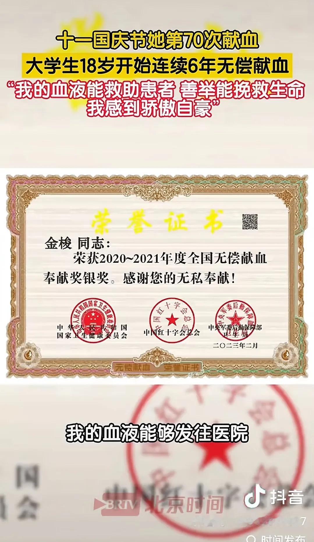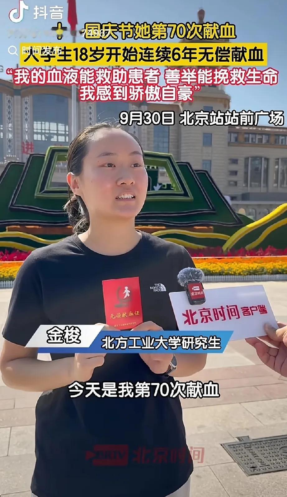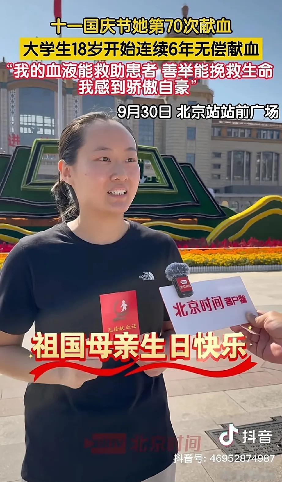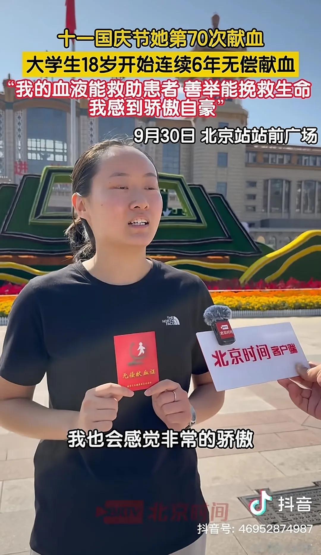 24岁的她已经无偿献血六年,在第76个国庆节是她第70次献血,争取明年国庆节献到