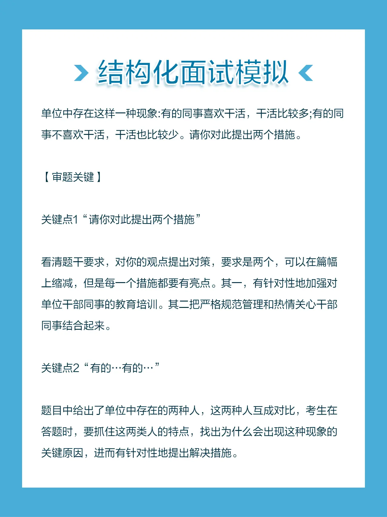 面试 结构化面试 考公面试 面试模拟单位中存在这样一种现象:有的同事喜欢干活,干活比较多;有的同事不喜欢干活,干活也比较少。请你对此提出两个措施。