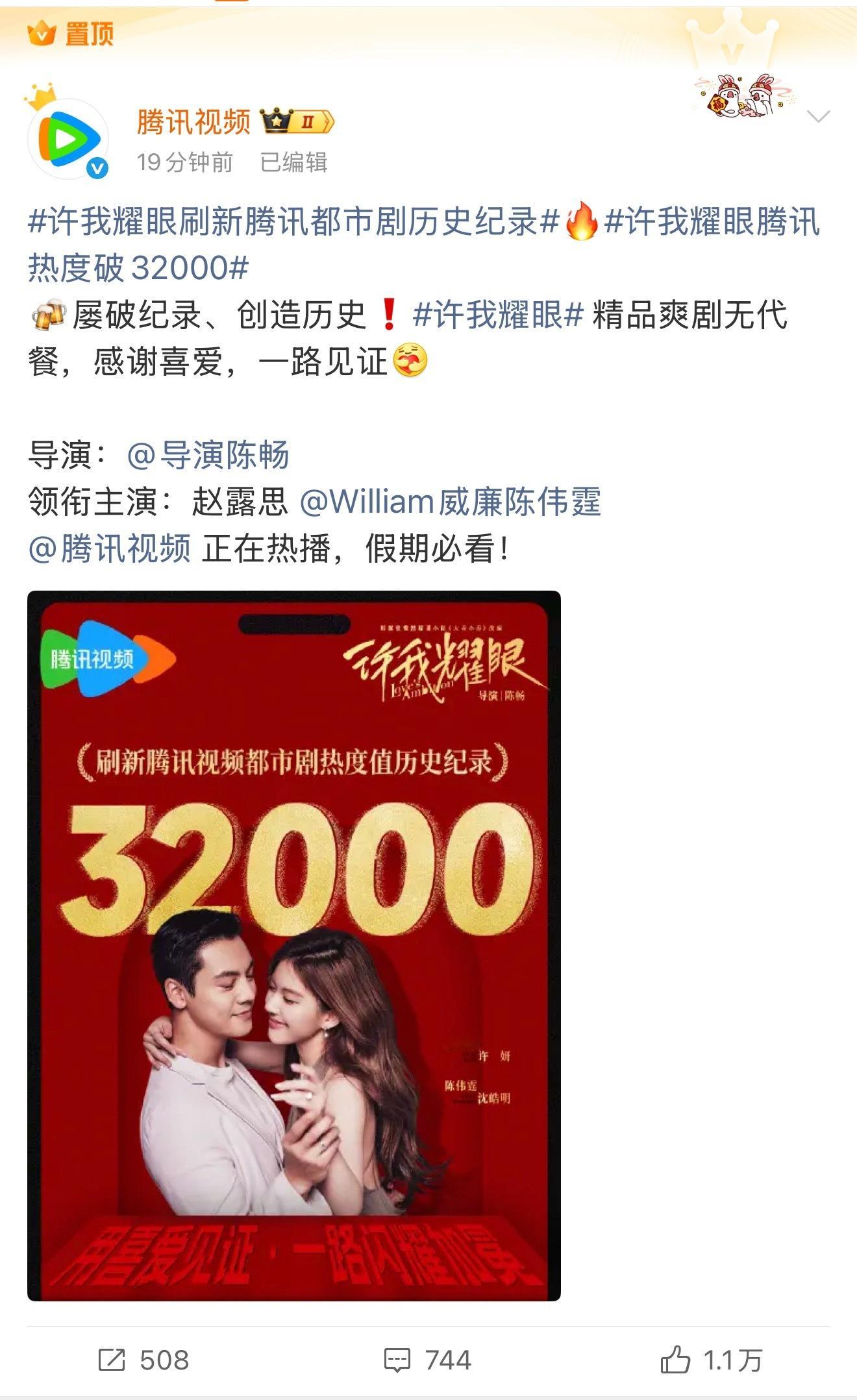 大腾讯置顶了《许我耀眼》破32000战报,喜欢赵露思和陈伟霆的人真的爽爆了[耶]