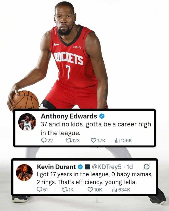 爱德华兹调侃杜兰特:“37岁,没有孩子,这应该是联盟新高。” 杜兰特回复:“在联