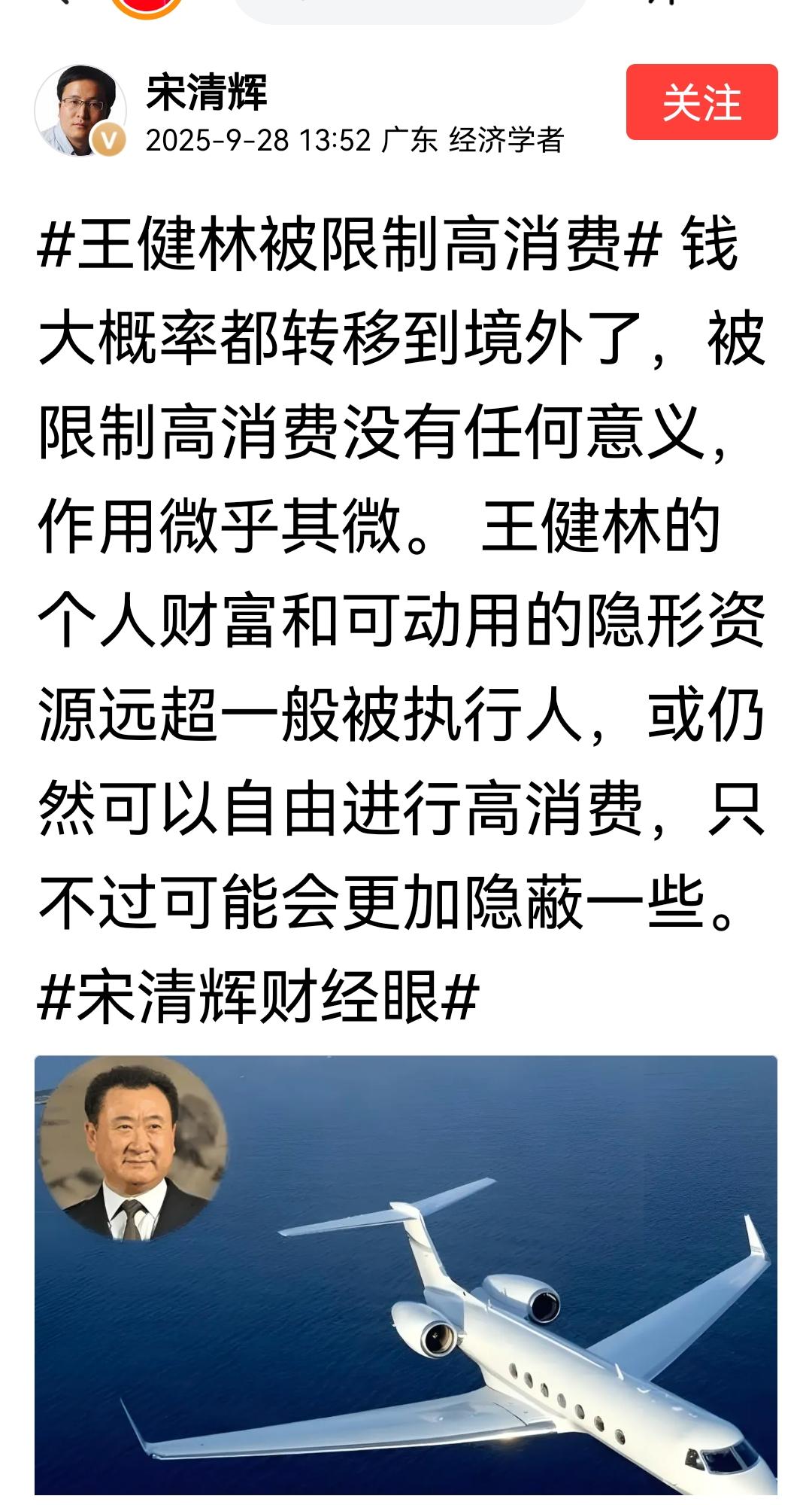 宋清辉说王建林的限制高消费对王建林的影响可谓是微无其微,限制高消费根本就没有意义,宋清辉敢这么说是因为他推断了王建林的隐形资源和财宣远超过一般被执行人。钱,大概率是转到国外去了! 这无根无据的一番话让人真的产生了无限遐想! 先不说王建林的“限高”通告一日游,单单凭王建林历经了那么多卖卖卖的操作,他如果想甩开膀子不干了,润出去,早就润了。 在行业王建林干了那么多年在行业中地更是有口皆碑,老许都进去了,老王如果有点忌惮的话他能不做准备? 宋清辉这推断真没有一个大V应有的肚量和水平!难怪刚才翻看了他的朋友圈,很冷清啊!