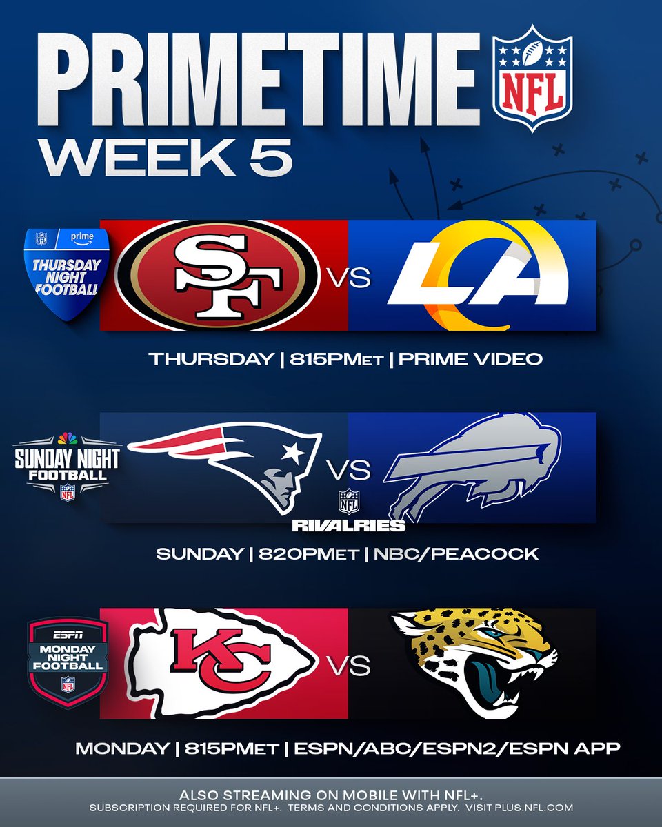 NFL官方X账号发推特报道,以下是我们在第五周黄金时段为您准备的赛事安排✨:在@NFLPlus上观看直播