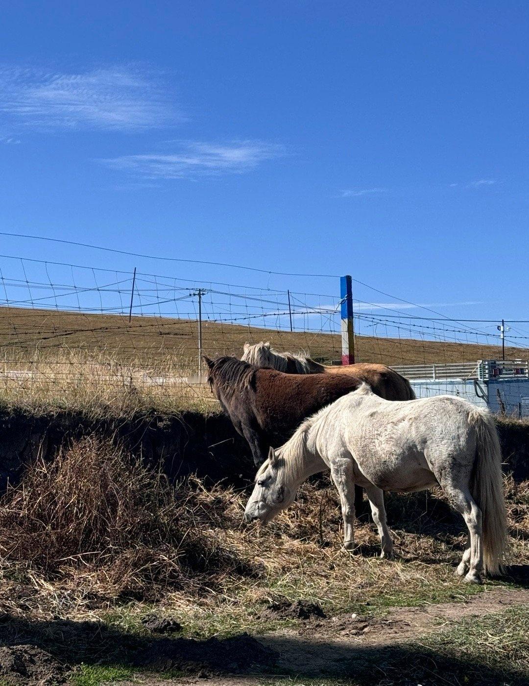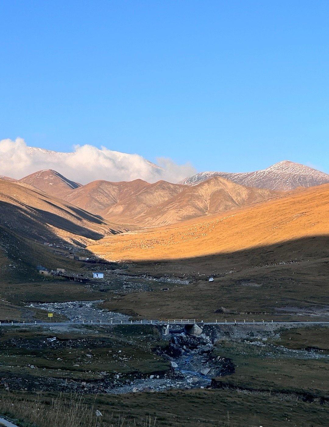 『自驾青甘大环线』第一站•青海湖 青海湖作为世界上海拔最高的湖泊之一,远远看去仿佛比地平线高出一大截。秋季的青海比较冷,植被泛黄,于是你就能由远及近的看到湛蓝色的天空、皑皑雪山、深蓝的湖水,黄色的草坪。最可爱的是路上的可爱撒欢的小马,牧羊人赶着羊群涌向汽车,还有散养的黑色牦牛,是如此的生动活泼。 可惜由于前方车祸,堵了去茶卡盐湖的路,我们转而另辟蹊径打算绕路,于是看到傍晚绵延的山脉,金色的夕阳洒落山头,天空中还看到了像佛光的彩虹。
