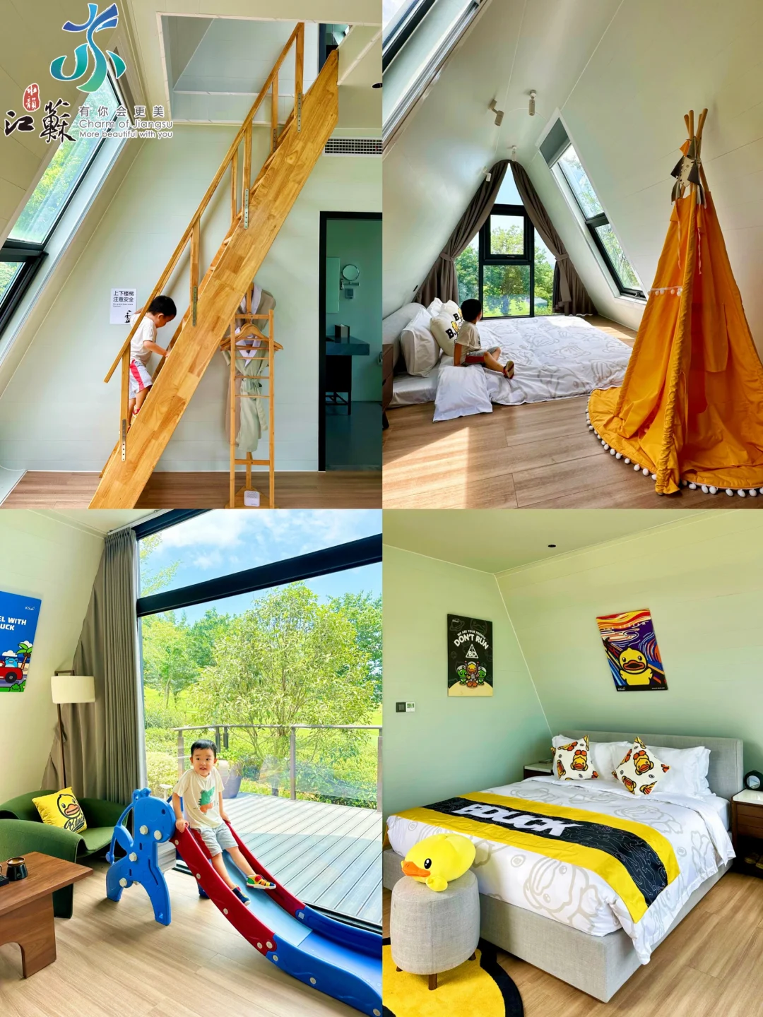 我们住的星空阁loft,丛林中的三角形房子,小朋友超喜欢~两层的loft,上了楼梯是榻榻米+小帐篷,毛毛把那里当作他的秘密基地~小朋友超喜欢酒店的火车房,住在真的火车里面!但是满了没住上,在外面看看吧😂