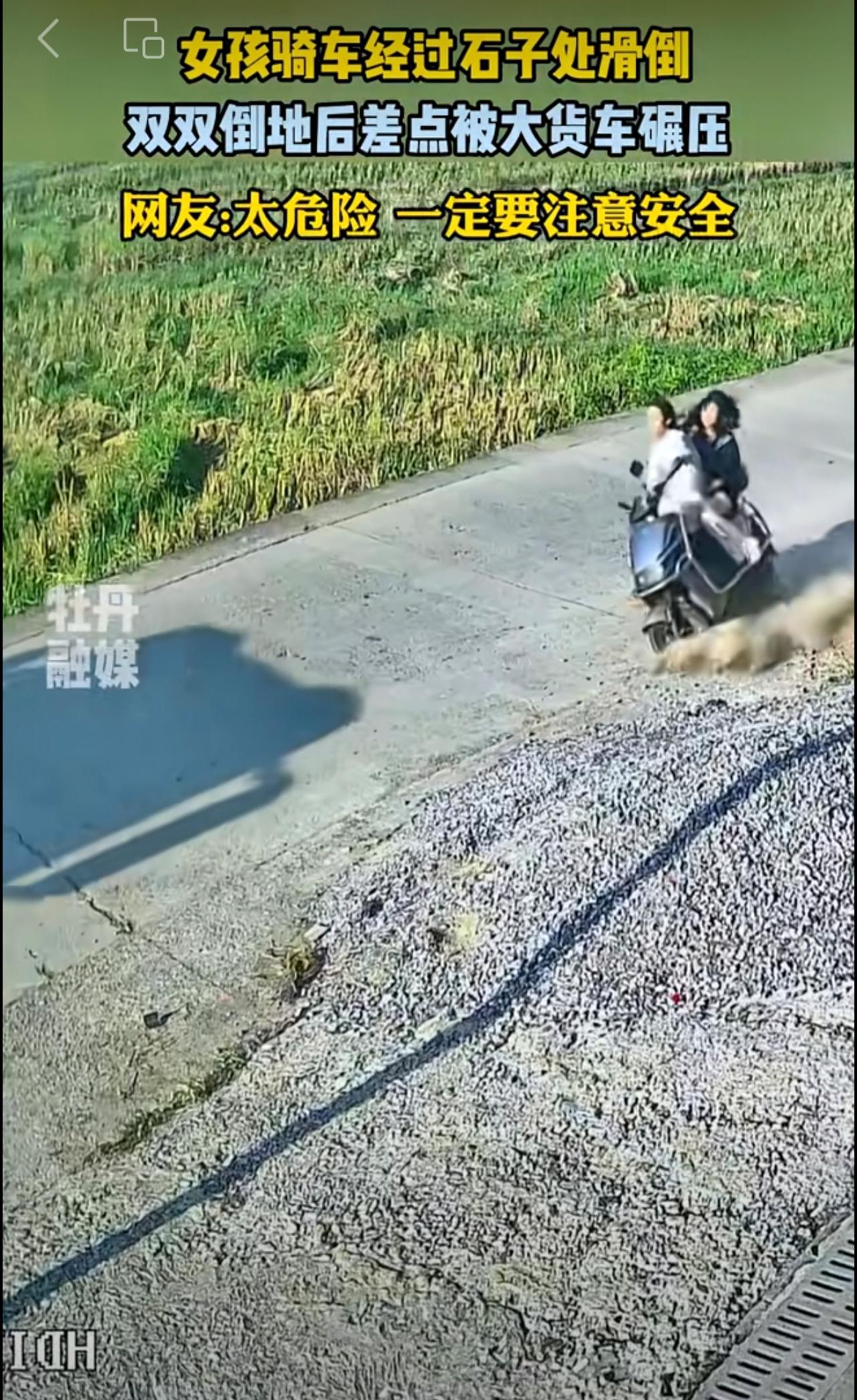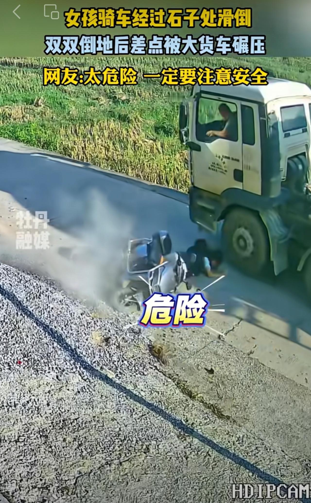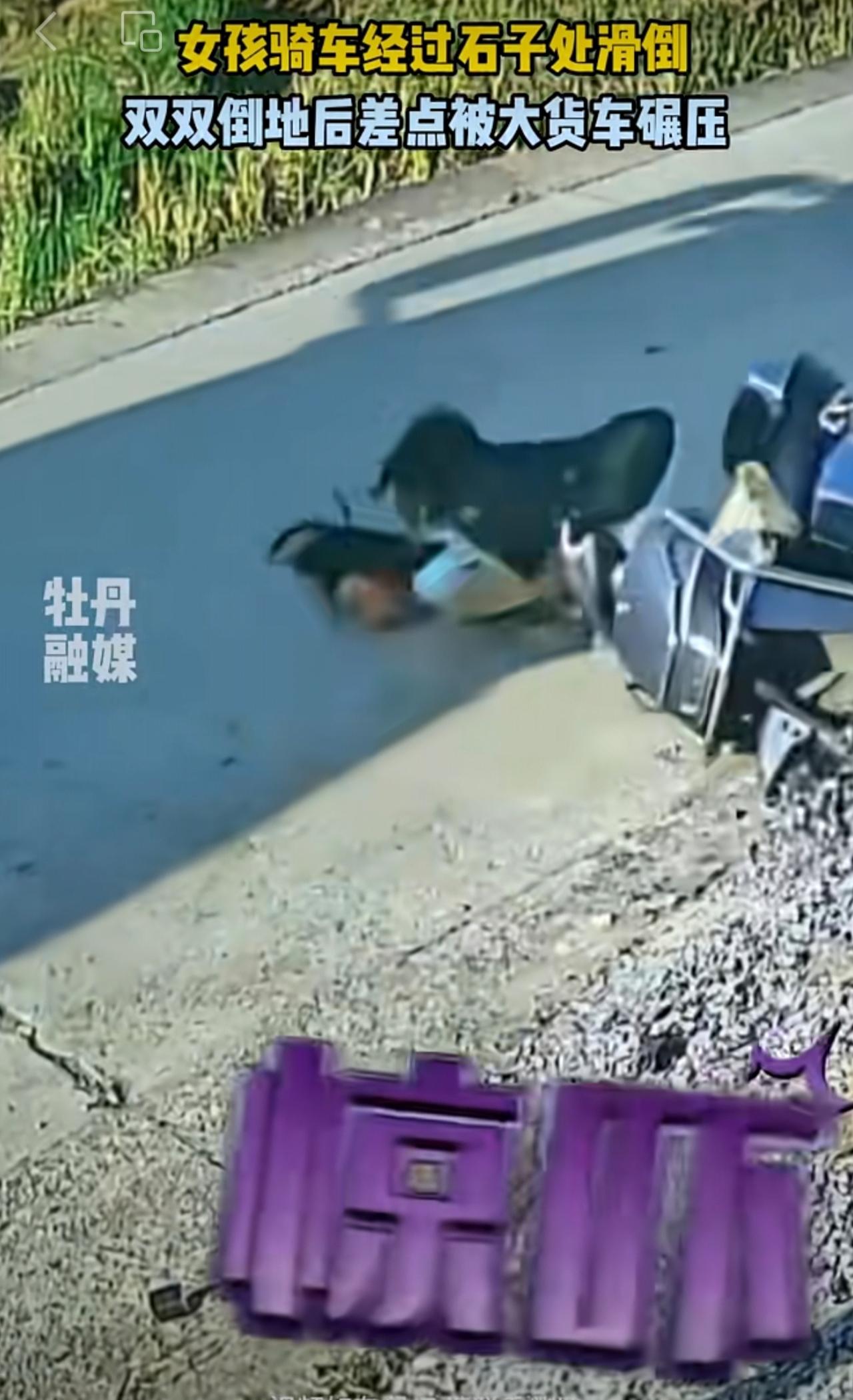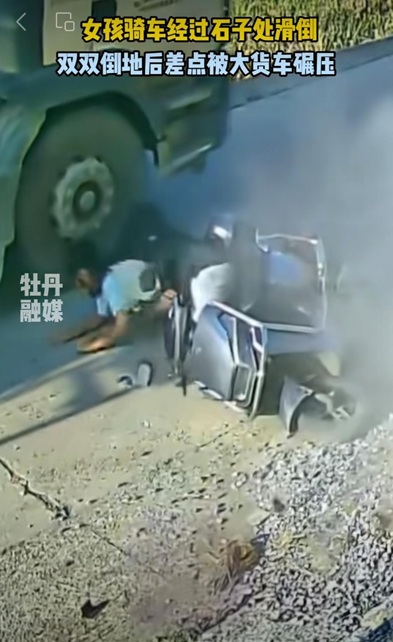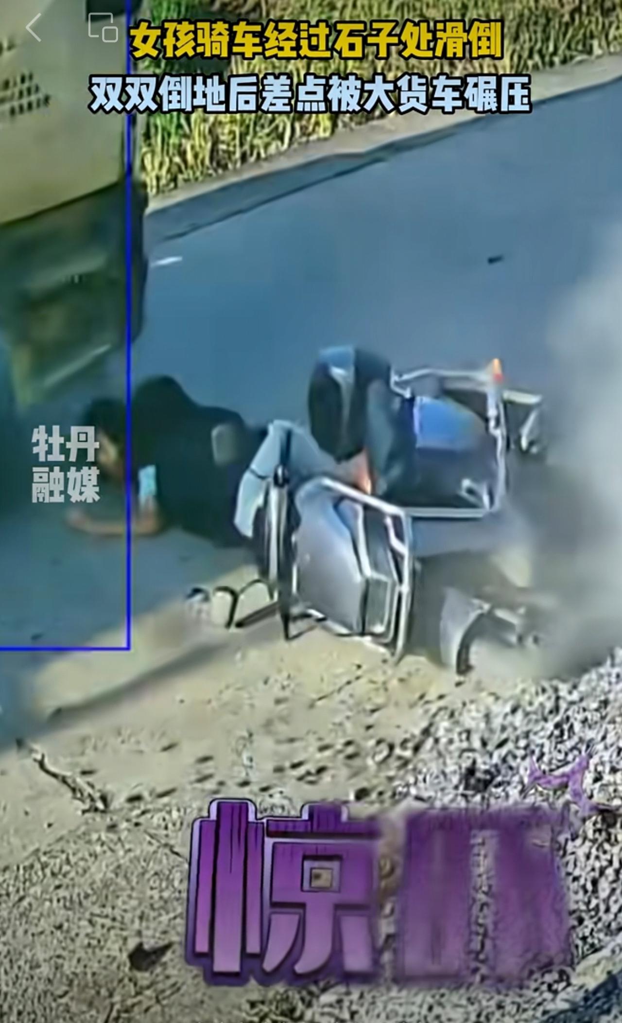 女孩骑车经过石子处滑倒,双双倒地后差点被大货车碾压。