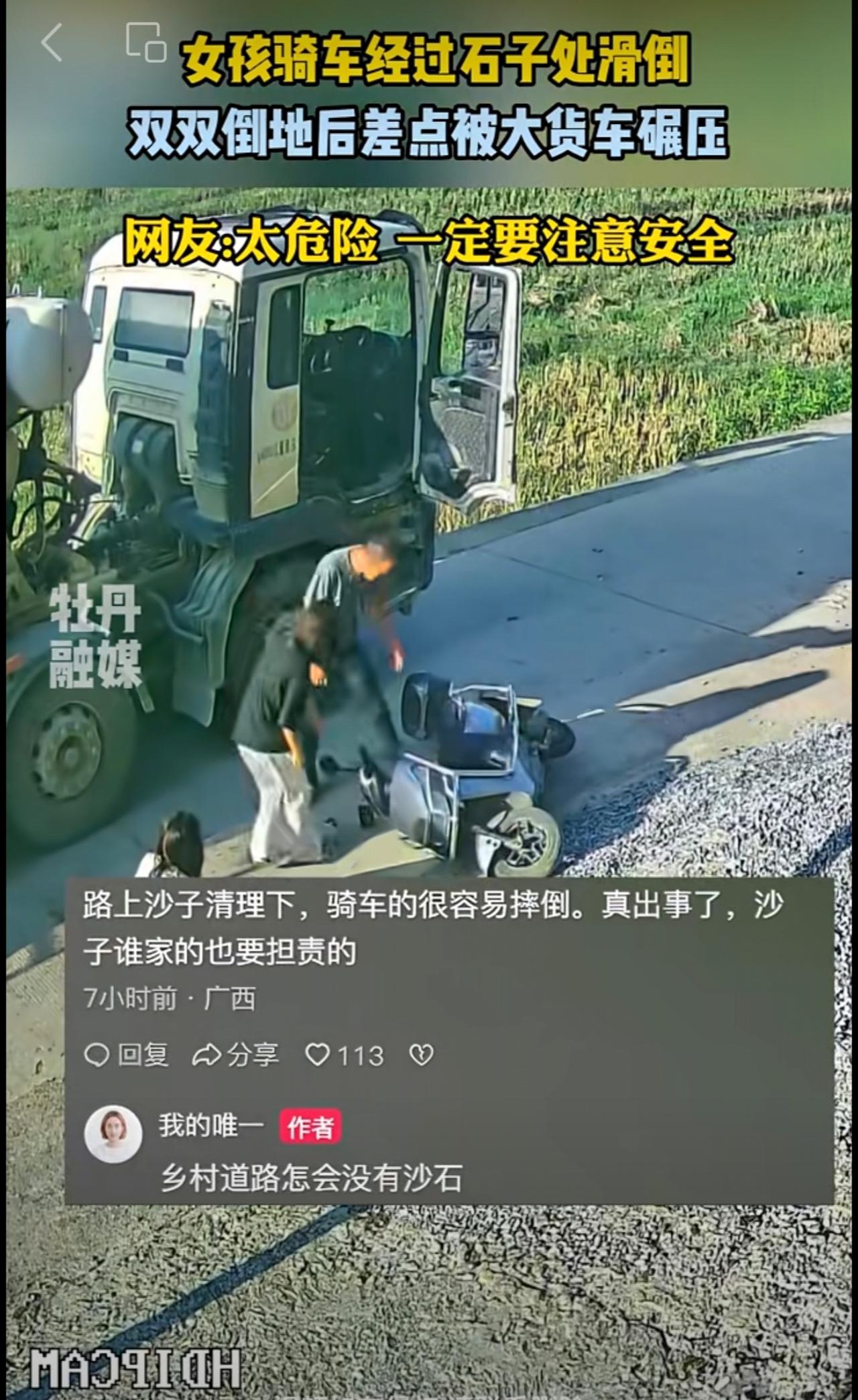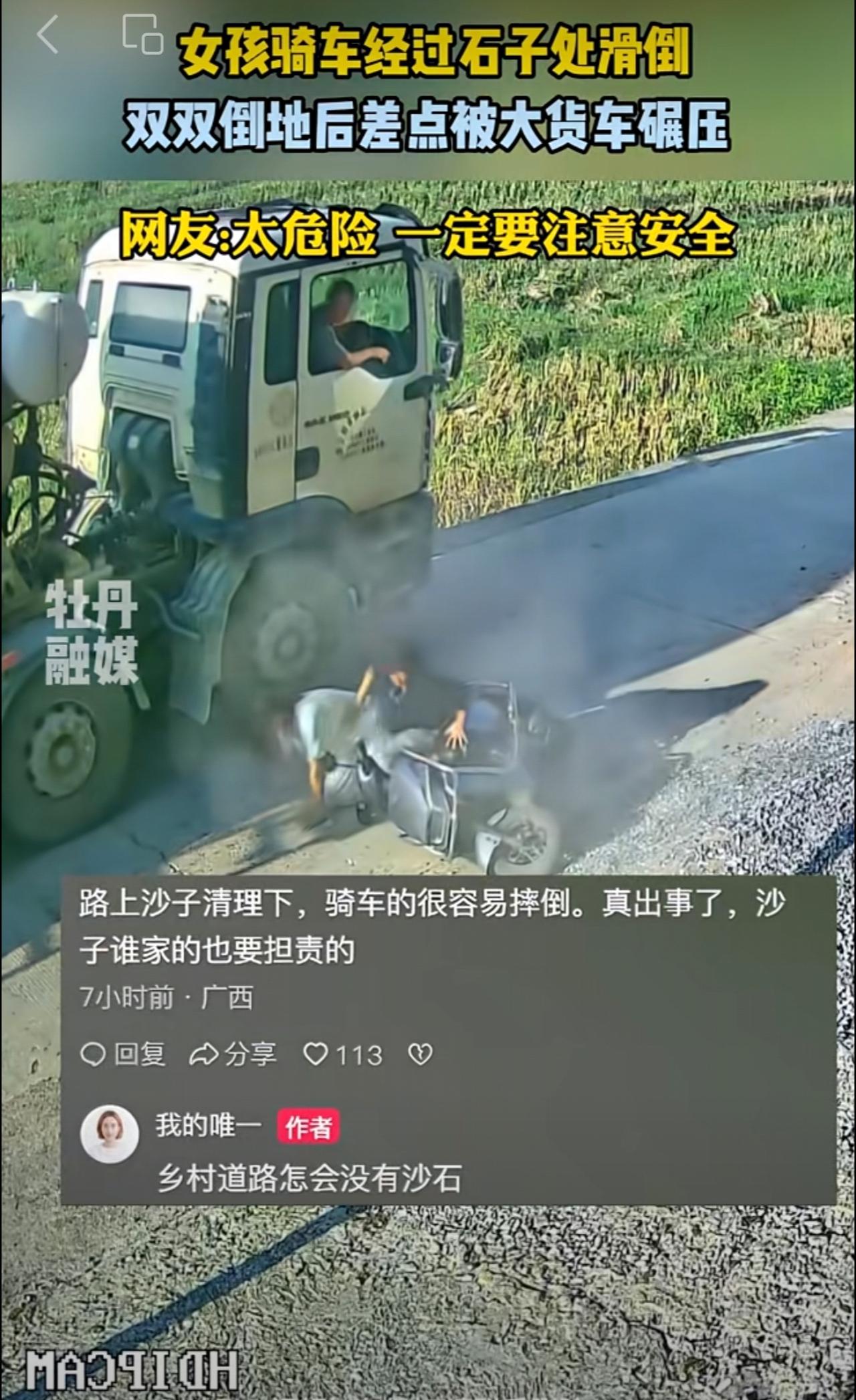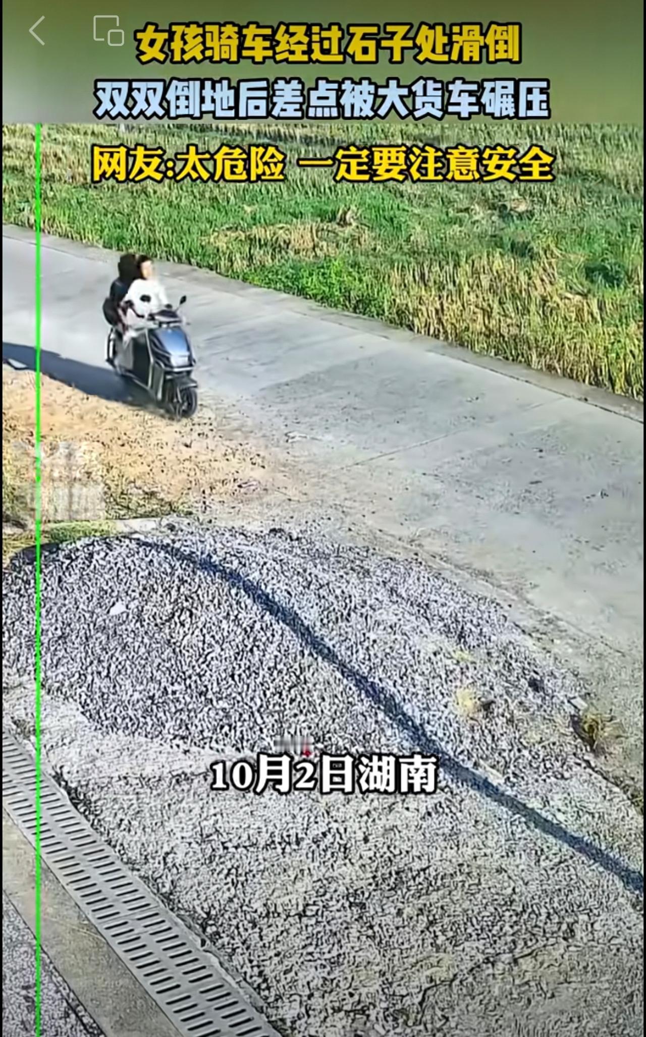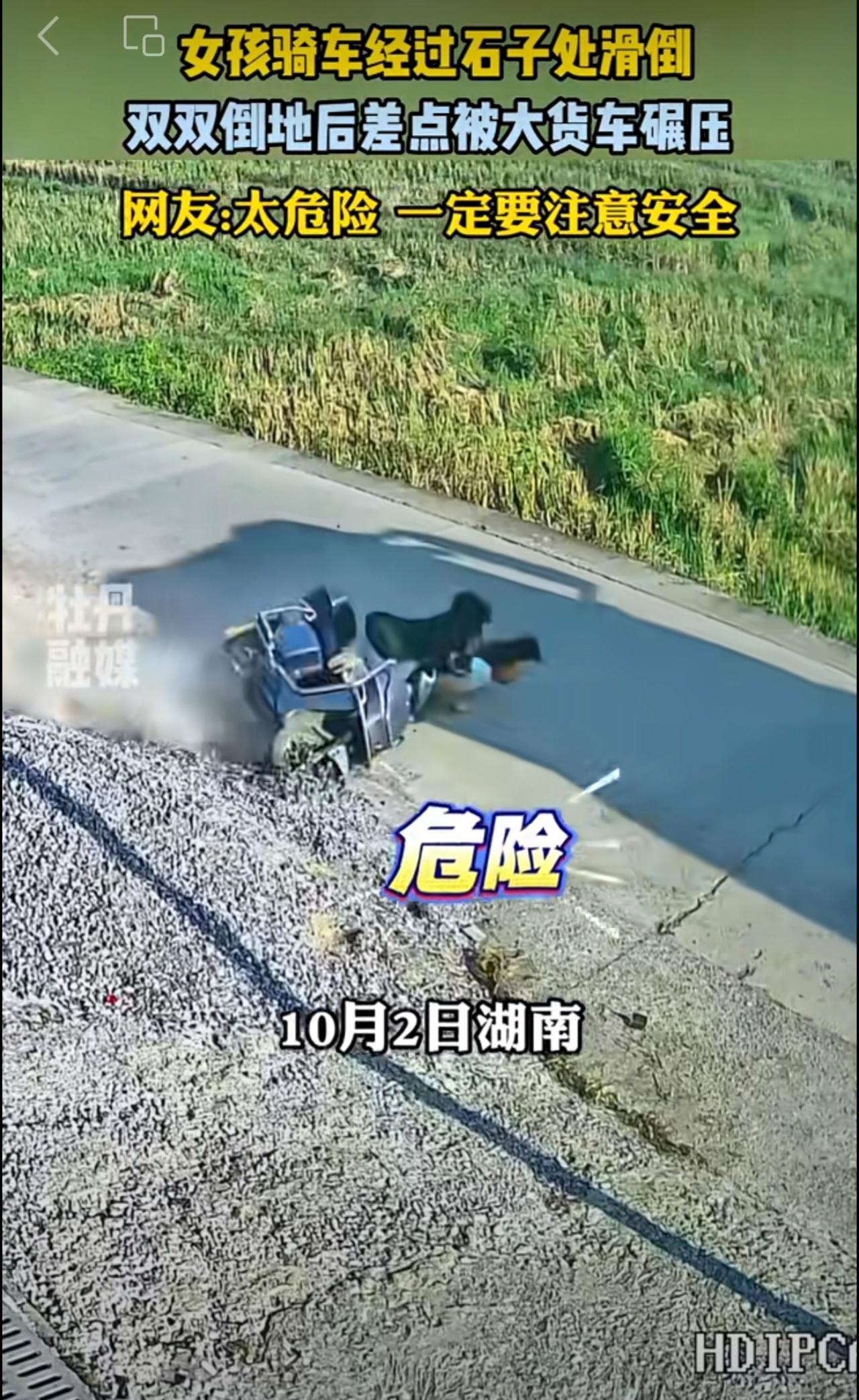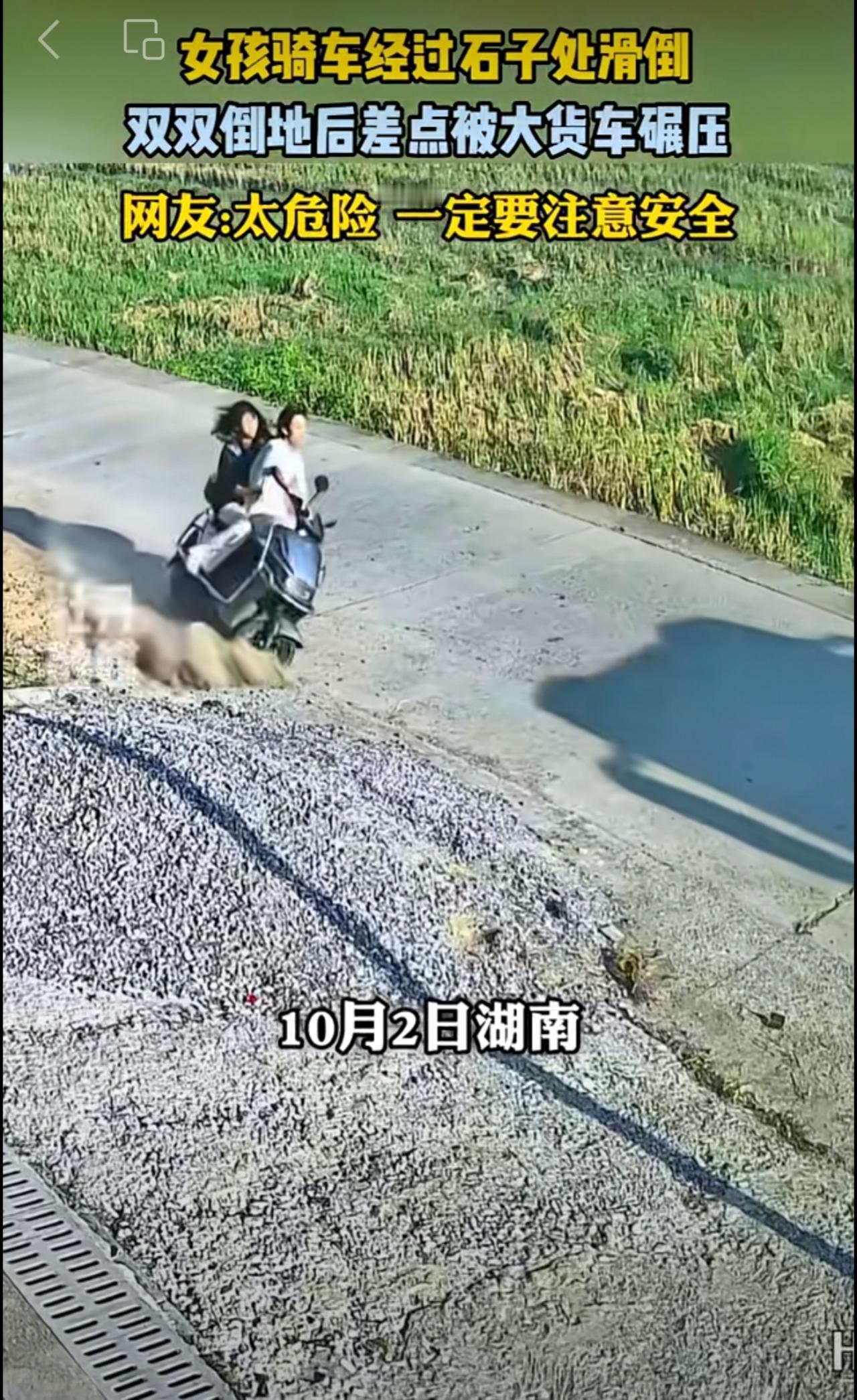 女孩骑车经过石子处滑倒,双双倒地后差点被大货车碾压。