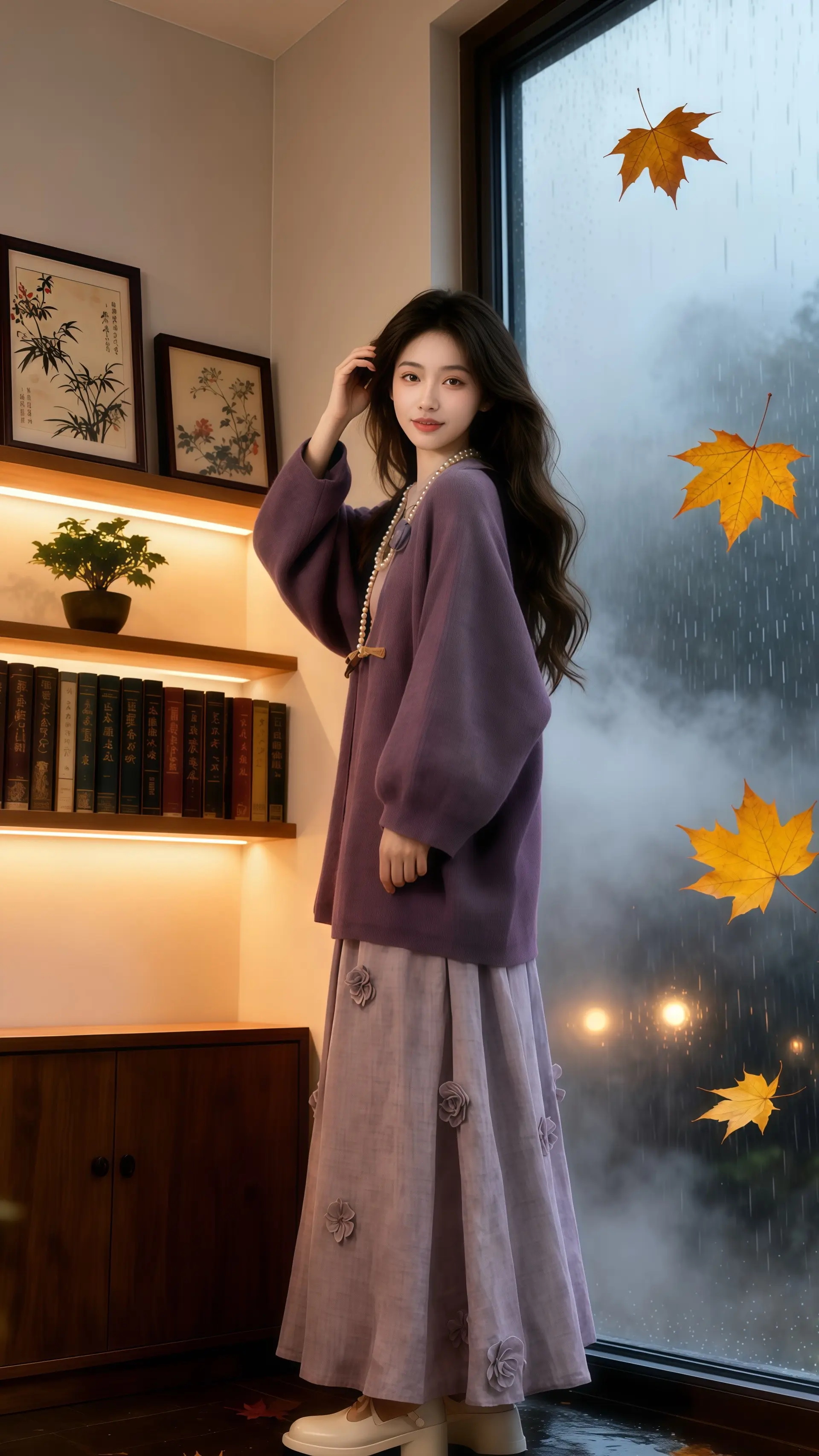 她身着新中式国风盘扣针织外套连衣裙两件套,于古筝房内静赏秋景。窗外小雨朦胧,雾气氤氲中,金黄的枫叶似跳动的音符,与古筝弦上流淌的乐韵相映成趣。浅紫色针织外套的盘扣在暖光下泛着温润光泽,裙摆处精致的刺绣花朵随她轻移莲步微微颤动。她时而端坐古筝前,指尖似要抚上琴弦,时而凭窗而立,目光沉醉于雨雾中的秋意。这套两件套将传统元素与现代剪裁巧妙融合,宽松的外套衬得她温婉恬静,飘逸的长裙尽显东方雅韵,在这雅致的古筝房内,她与这朦胧秋景,共同谱写着一曲古典与现代交织的诗意乐章。