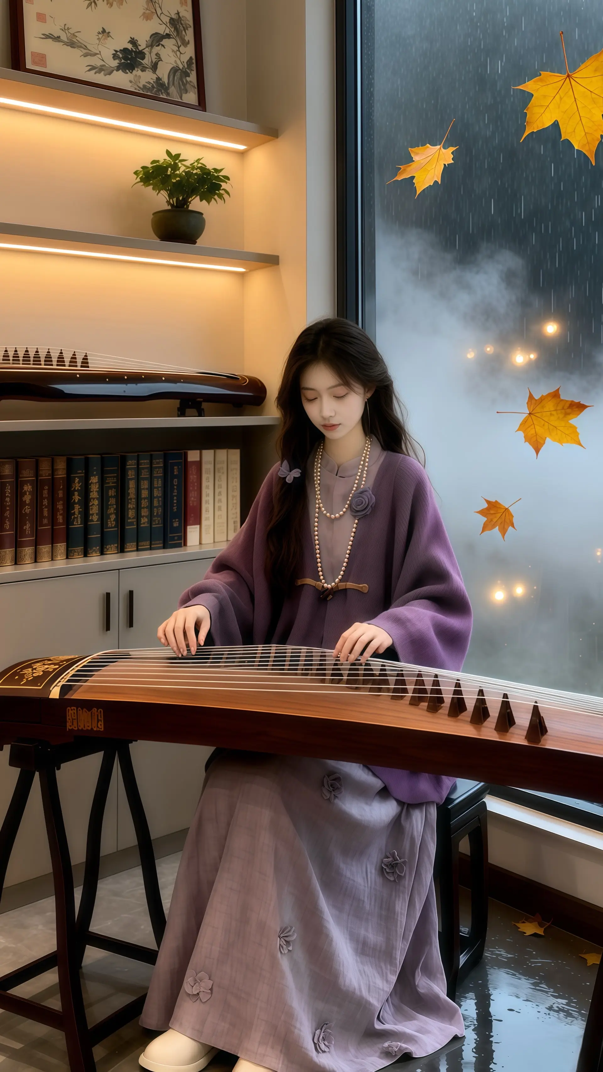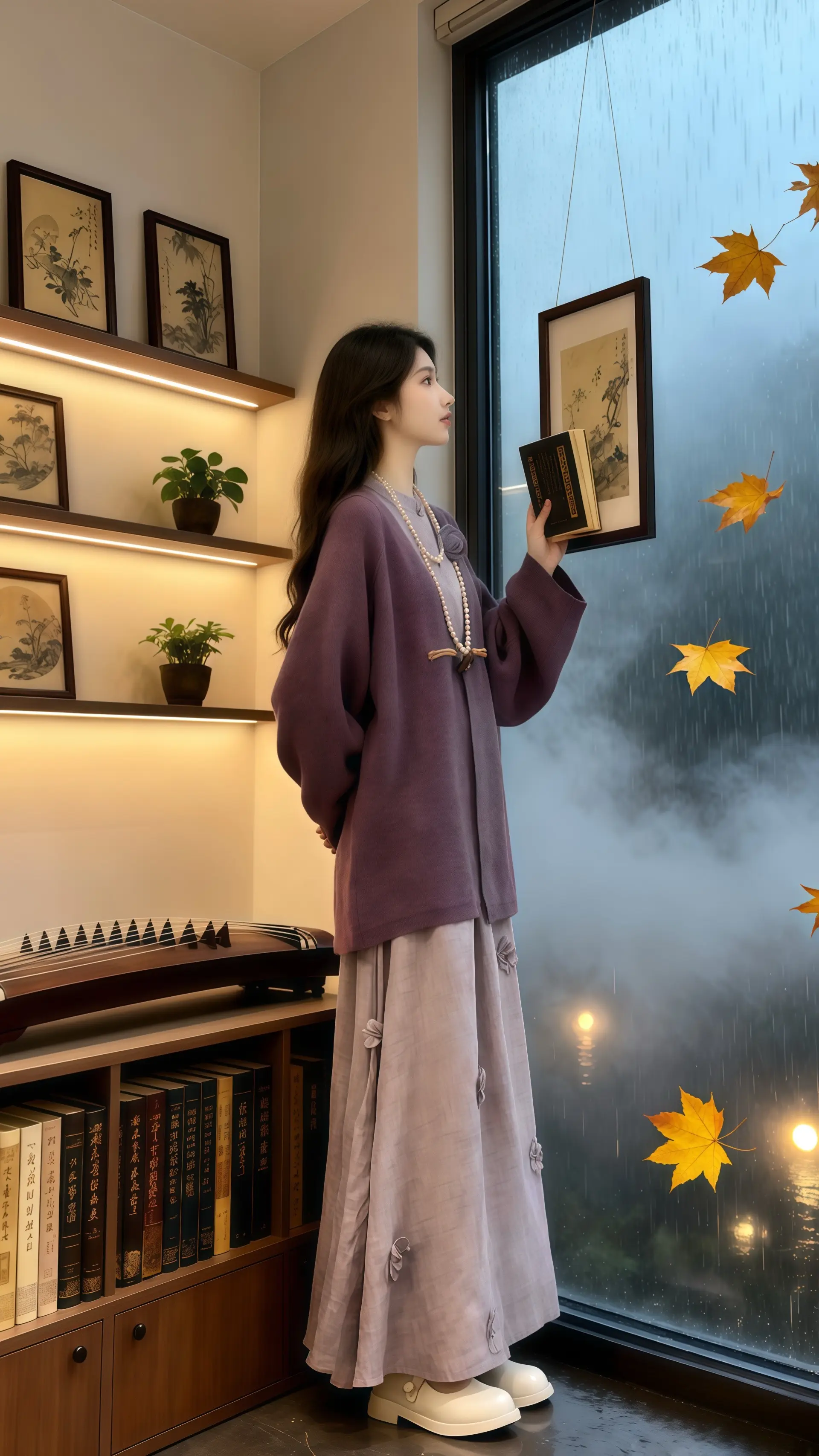 她身着新中式国风盘扣针织外套连衣裙两件套,于古筝房内静赏秋景。窗外小雨...