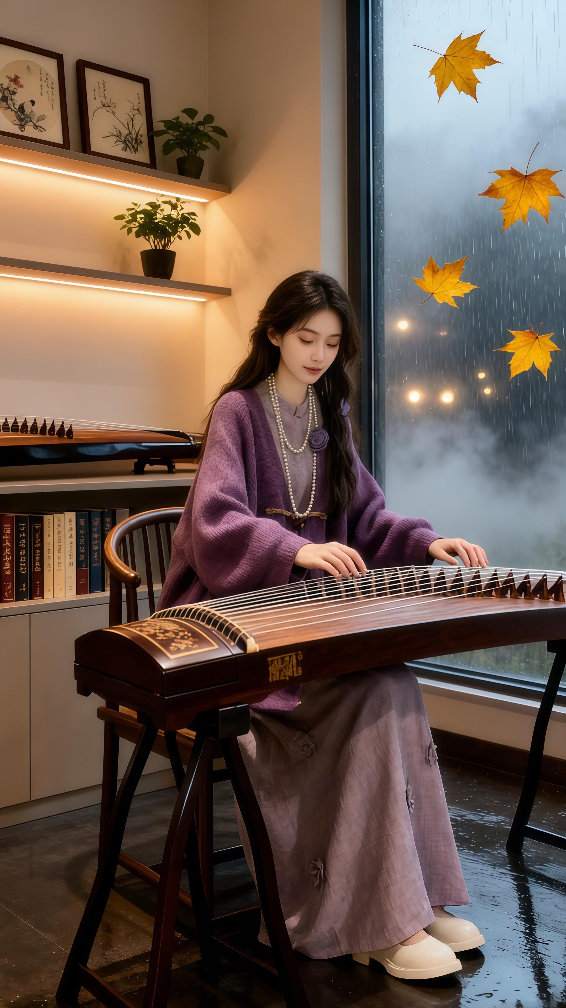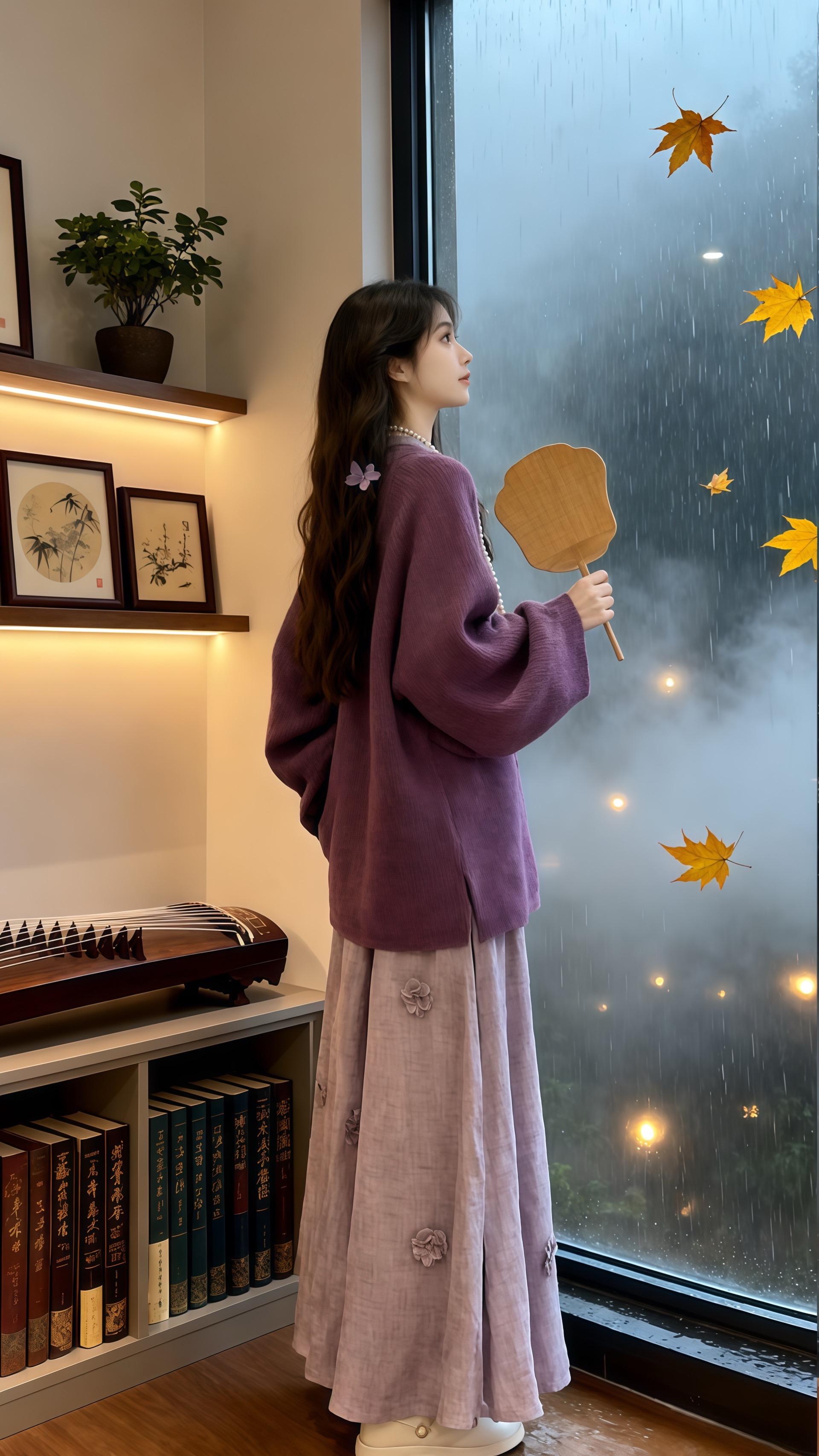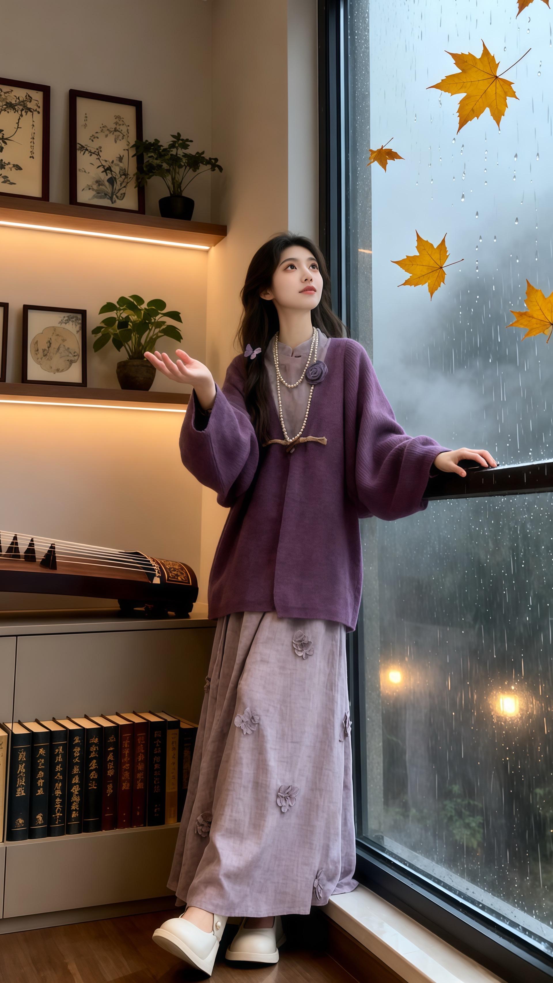 她穿着新中式国风盘针织外套连衣裙两件套,静立在雅致的古筝房内。米白针织勾勒出温婉轮廓,盘扣细节暗藏东方韵味,与屋内暖光架子上的国风画框相映成趣。落地窗外,秋雨朦胧,雾气中斑驳的灯光晕染开来,几片金黄枫树叶随风轻飘。她指尖轻拂过架上平放的古筝弦,目光却望向窗外的秋景,架子下的古书静静陈列,绿植在暖光下舒展叶片。新中式的雅致与秋雨天的诗意交融,时光仿佛在此刻慢了下来,每一处细节都透着东方美学的静谧与浪漫。