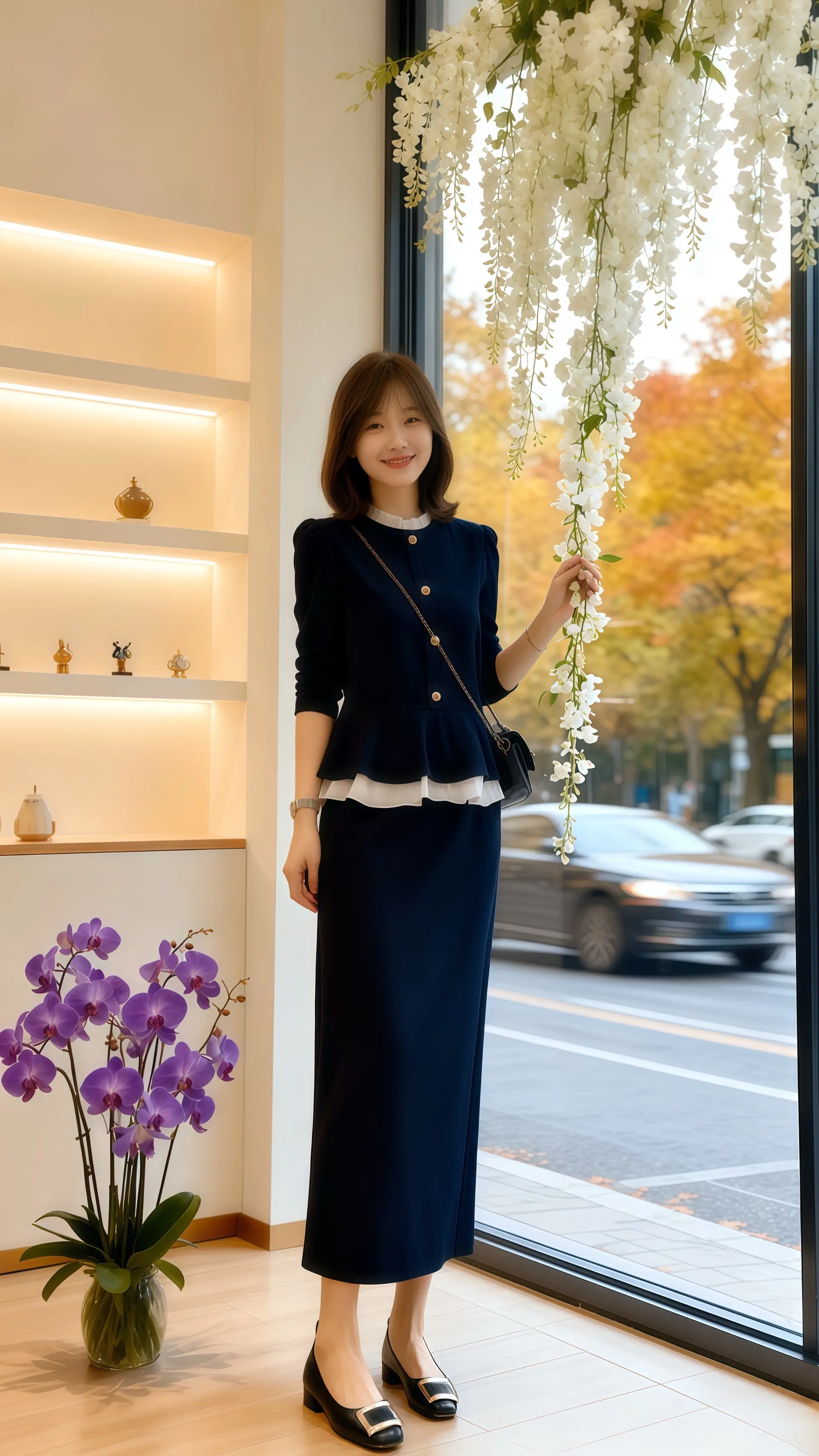 她穿着高级感气质连衣裙,利落剪裁衬得身姿窈窕,灵动的荷叶边设计又添几分柔美。窗外是浓得化不开的秋意,金黄的银杏与深红的枫香交织成画,偶有落叶打着旋儿飘过。她静立窗前,裙角与秋叶相映,温柔了岁月。无需过多修饰,一件有质感的连衣裙,便能与这诗意秋景撞个满怀,尽显从容大气的女性魅力。