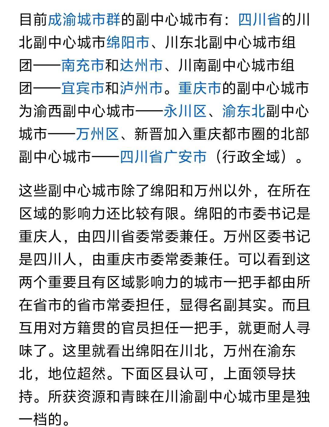 没想到广安竟然成了重庆北部区域的副中心城市,这也许是只有川渝两地的才有的创新之举。目前四川的副中心城市有川北区域绵阳、川东北南充达州组团、川南宜宾泸州组团,而重庆的副中心城市有渝东北区域万州、渝西区域永川、渝北区域广安,而真正意义上的副中心城市只有绵阳和万州两地,都是由常委兼任地方书记的,可见这两地的重要性不言而喻,而不管是南充-达州、还是宜宾-泸州、永川等地,其实力和地位以及影响力还是落后一大截,而广安加入重庆成为重庆北部副中心城市,对于广安的发展机遇不容错过,而广安也可以作为重庆的后备和粮仓,深度融合发展带来的也是不错的机遇和经济实力提升。相信这也是川渝两地和老辈子喜闻乐见愿意看到的画面。