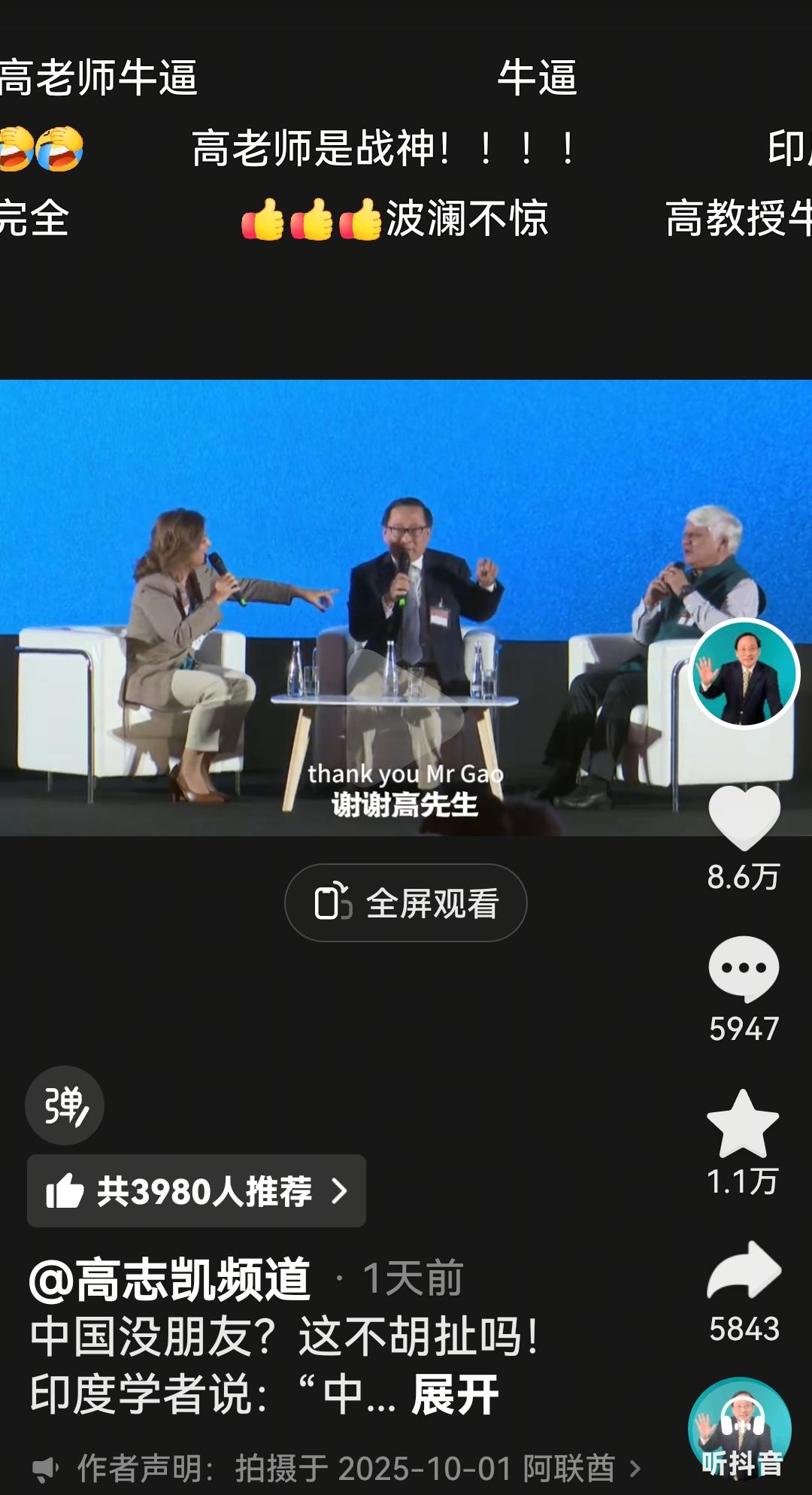 高志凯老师又火力全开了 印度学者说咱们没有“朋友” 高志凯老师说,纳伦达,我把你当成 朋友,如果印度不把中国当成朋友,印度将永远不会成为联合国安全理事会常任理事国,高老师说为什么,因为有中国有一票否决权 这句话一说不打紧,印度三哥直接摇头了 这是戳印度的软肋啊 我听了全过程,感觉印度三哥这次的学者英语学的挺好,其次感觉印度这个学者是把咱们各种扣帽子,感觉是他自己目的,然后他说别人这了那了高志凯印度辩论 高志凯 图片来自网络截图