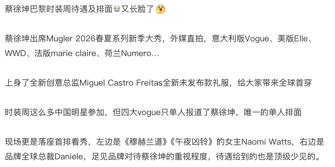 蔡徐坤国际认可度 蔡徐坤的国际认可度完全就是免检权威级别,vogue四大地区都分享了蔡徐坤的个人直拍,谁懂这个含金量!秀场图更是看到品牌对艺人的重视,在一众高管艺人中,蔡徐坤稳居首排c位!不仅如此,哥的出图也稳的一批,出图即大片!