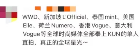 蔡徐坤国际认可度蔡徐坤的国际认可度完全就是免检权威级别,vogue四大地区都分