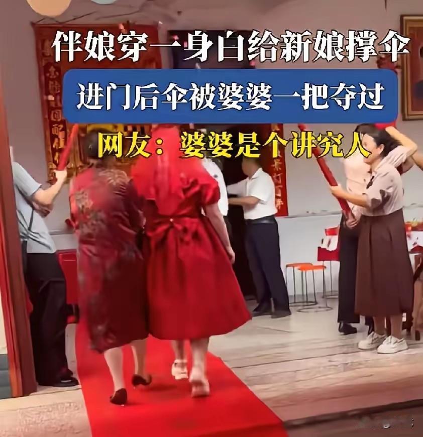 婚礼当天,伴娘身着白色礼服为新娘撑伞遮阳,这本是再寻常不过的仪式环节。然而,当新娘踏入婆家门槛时,婆婆突然推开伴娘,一把夺过伞的动作,让现场瞬间凝固。婆婆的“讲究”显而易见,白色在传统观念中象征丧事,而中式婚礼忌白是根深蒂固的禁忌。但她的处理方式却暴露了另一面:对伴娘尊严的漠视,仿佛一件工具比人更重要。 红盖头下是一身混搭的装扮:既非传统的中式嫁衣,也非西式婚纱,而是随意搭配的现代服饰;脚踩白色松糕鞋,手持手机,肩挎小包,仿佛婚礼只是她逛街途中的一站。这种“随性”与婆婆的“讲究”形成尖锐对比。更耐人寻味的是,伴娘的白色礼服若由新娘准备,说明她对此并无异议,甚至默许了这种“非传统”的审美。 婆婆的“野蛮”与新娘的“散漫”,本质是两种家庭观念的冲突。老一辈的婚礼是宗族仪式的展演,每一处细节都承载着祈福避讳的寓意;而年轻一代则将婚礼视为个人生活的注脚,舒适与自我表达优先。这场冲突中,无人真正“错误”,但双方对规则的认知差异,已为未来的婆媳关系埋下隐患。 若婆婆坚持用传统标准干预新人生活,而新娘拒绝妥协,同住一屋檐下的摩擦只会升级。婚礼像一面镜子,照见的不仅是当天的矛盾,更是未来家庭权力的博弈。或许,保持“一碗汤的距离”,才是对彼此最大的尊重。 一把伞撑起的不仅是阳光,更是两代人对“婚姻意义”的截然理解。当传统与现代无法调和时,物理距离或许比强行磨合更明智。