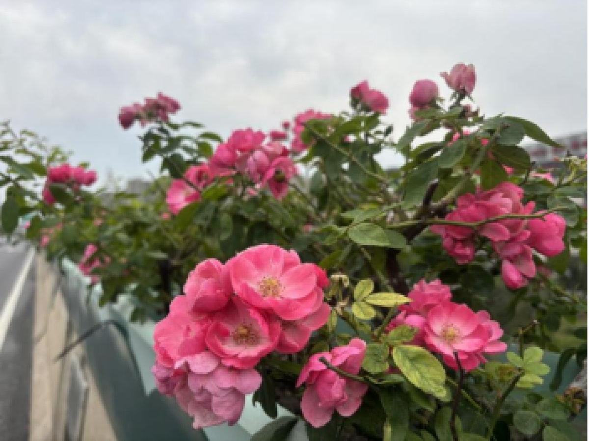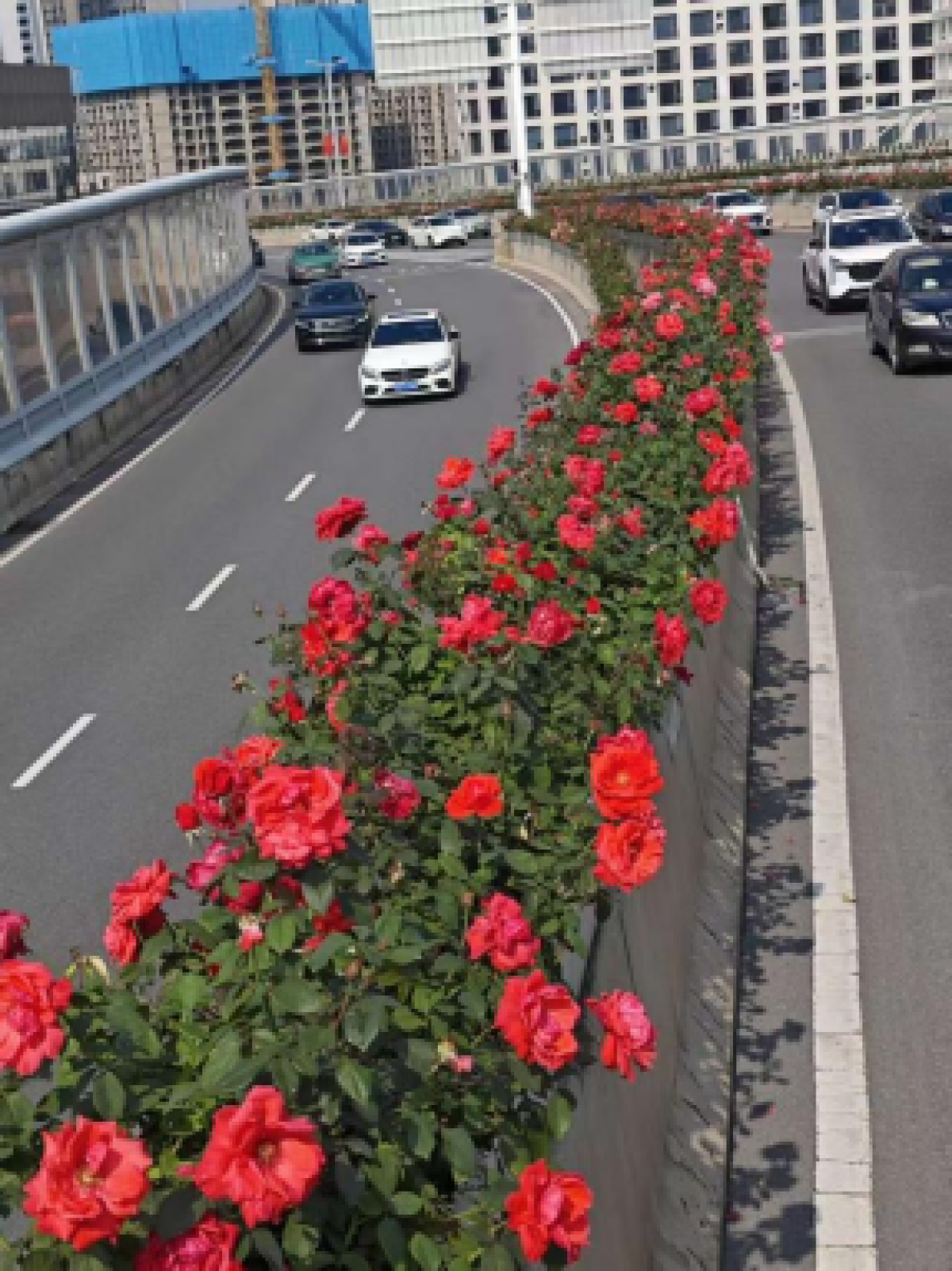 陇海路中州大道高架月季绽娇颜,朵朵含情,点亮市民出行途。