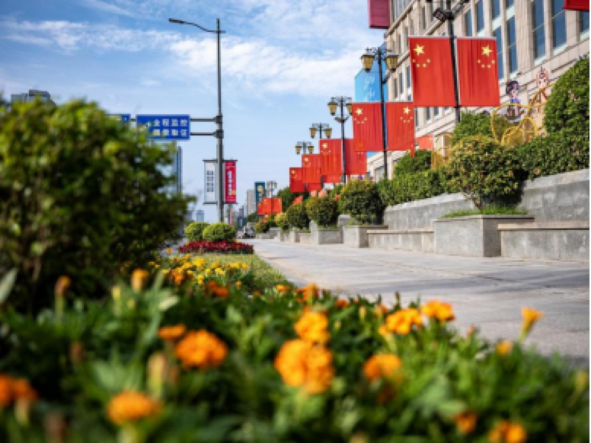 中原中路花簇开遍街角,与国旗相映成景,城市国庆热意正浓。