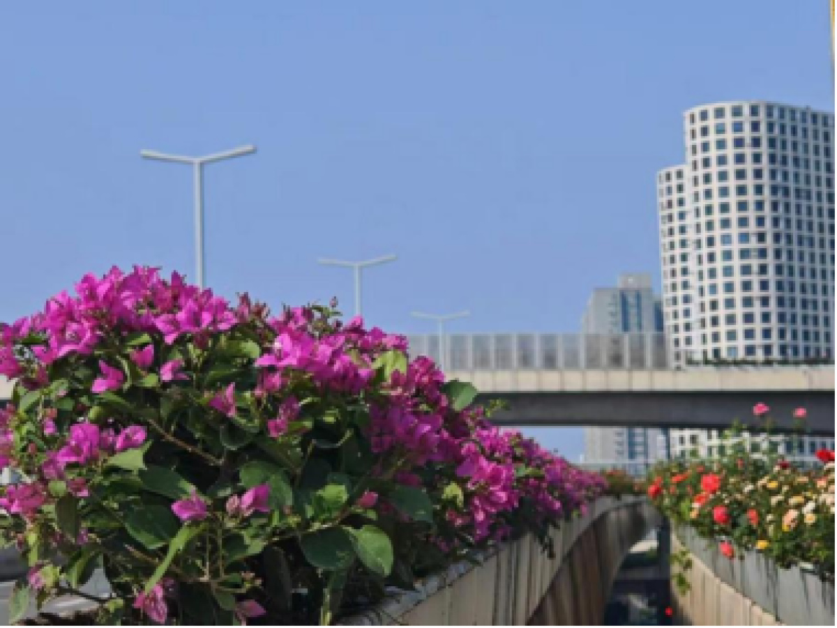 中州大道高架三角梅簇簇缀枝迎国庆,裹满秋日喜庆。