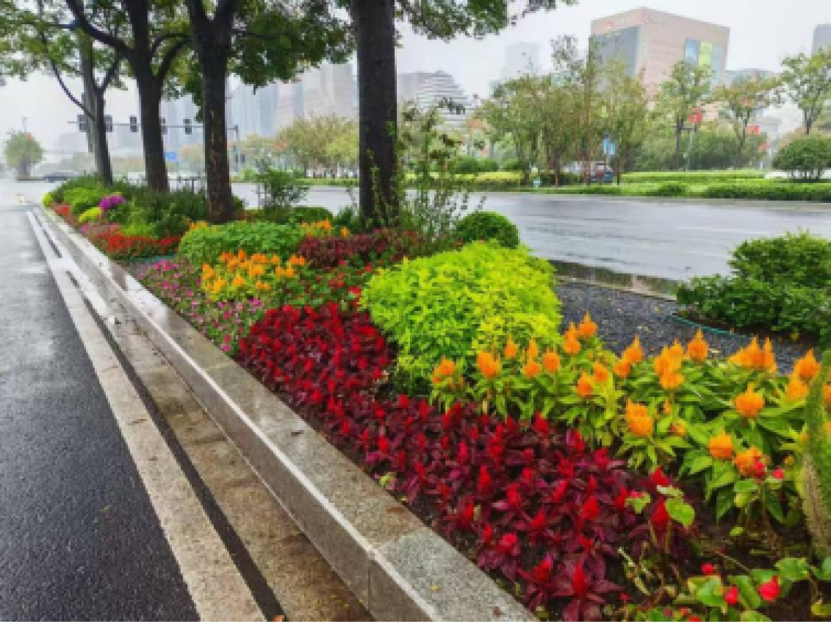 经南八路以花缀路韵,点点鲜妍悄然绽,染透国庆浓情。