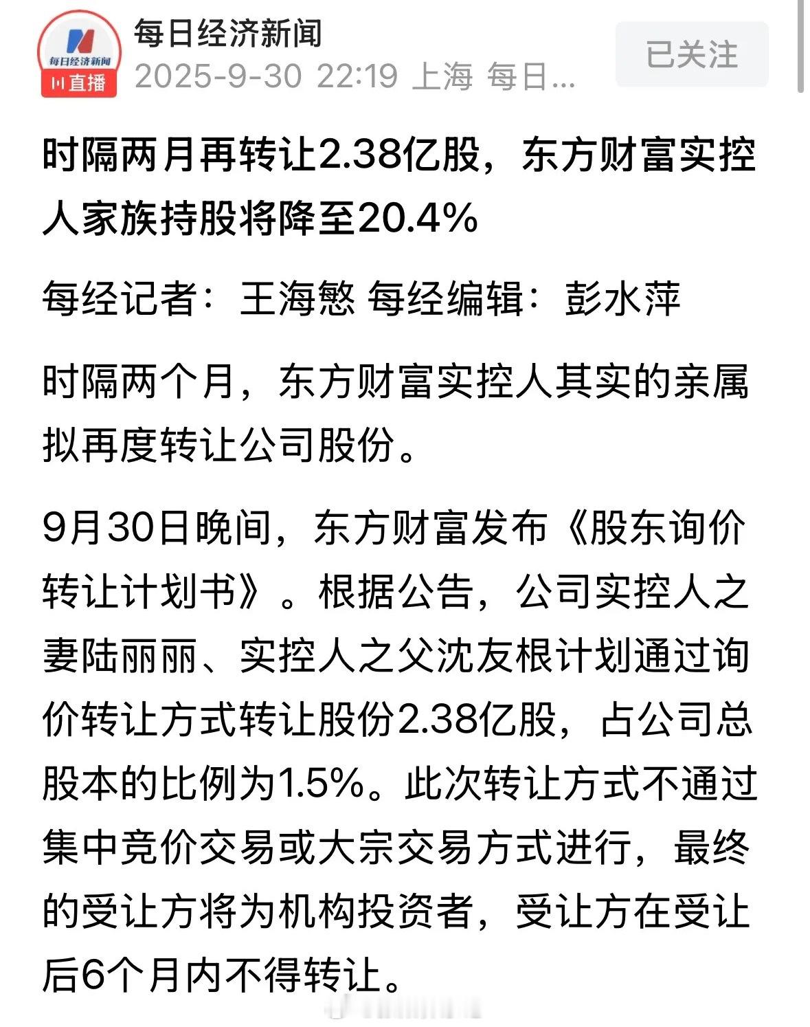 东方财富股东拟询价转让2.38亿股,对应市值超60亿元,转让后实控人及一致行动人持股比例将降至20.4%。