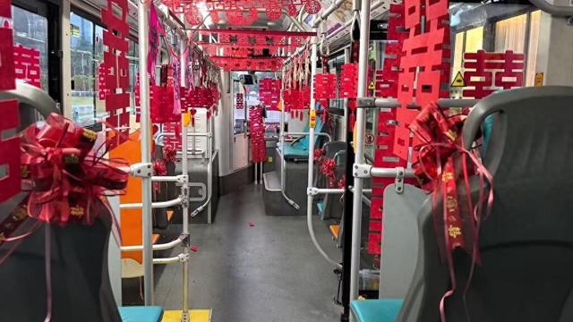 大红的喜字、喜庆的拉花和装饰,车身两侧“我们结婚啦”的贴纸,将公交车装饰得温馨喜庆,弥漫着甜蜜与浪漫。