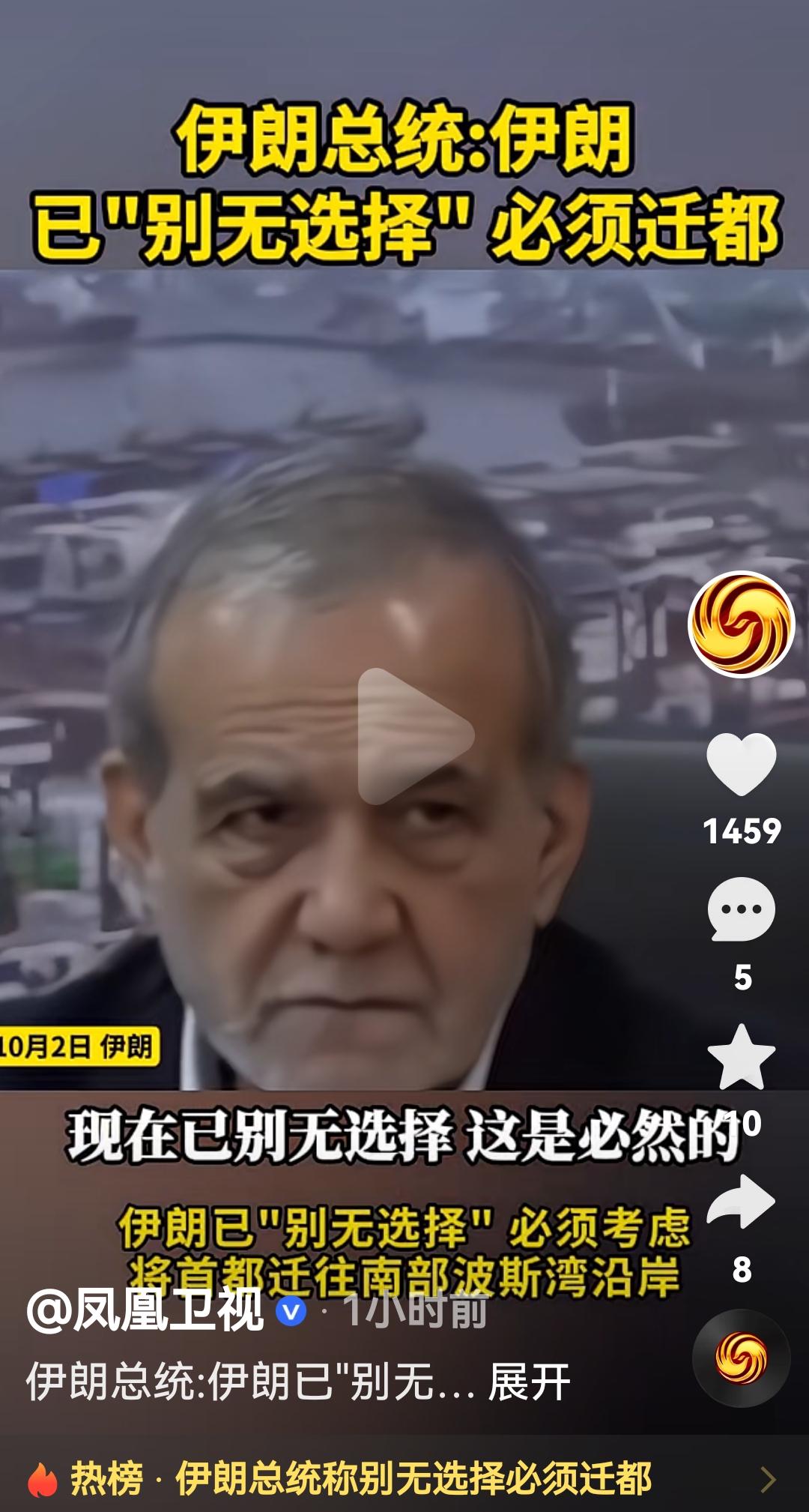伊朗总统说伊朗必须迁都 根据伊朗媒体报道,伊朗总统佩泽希齐杨说由于伊朗首都德黑兰水资源紧缺和德黑兰每年地面下沉威胁 现在已经别无选择,必须考虑将首都前往南部波斯湾沿岸 没有办法这样延续下去,德黑兰部分地区的地表面下沉30厘米,这非常可怕的,但是无法扭转 伊朗这可麻烦了,就是迁都也要防着以色列偷袭。当然希望伊朗换了新首都有新的气象八国支持“20点计划”能促使计划落实吗 以军拦截加沙援助船队事件你怎么看 图片来自凤凰卫视视频