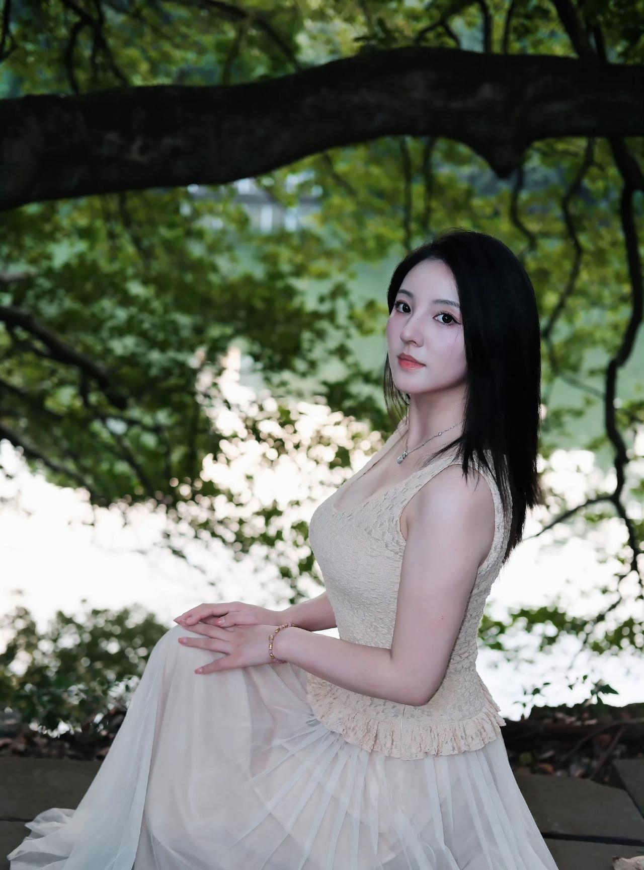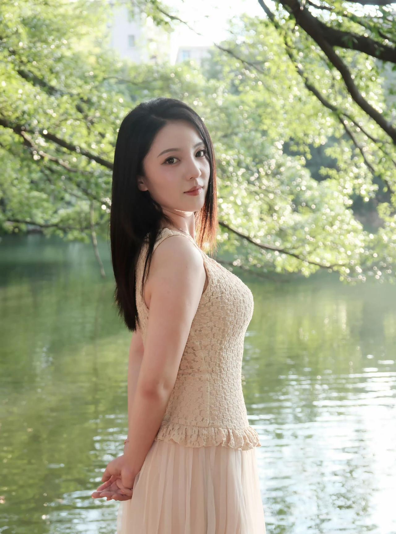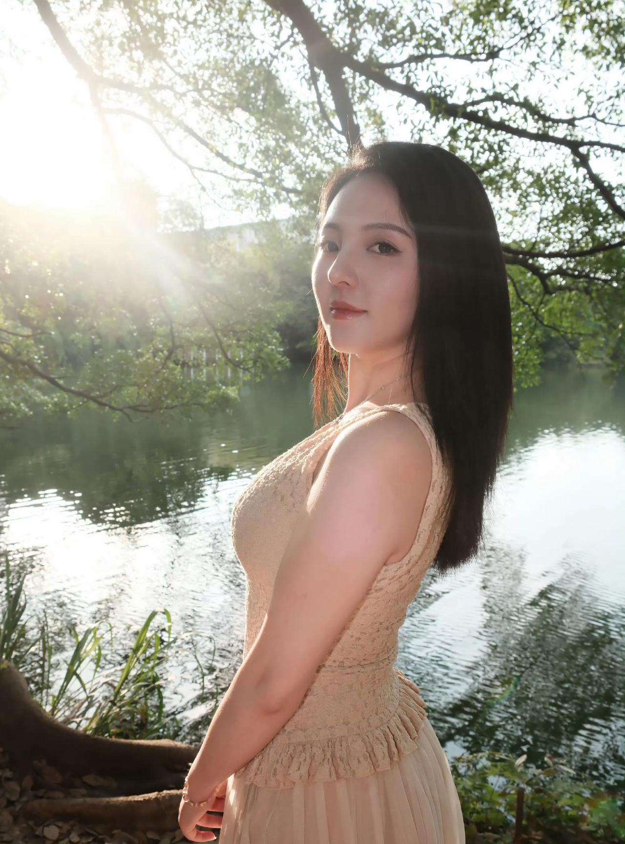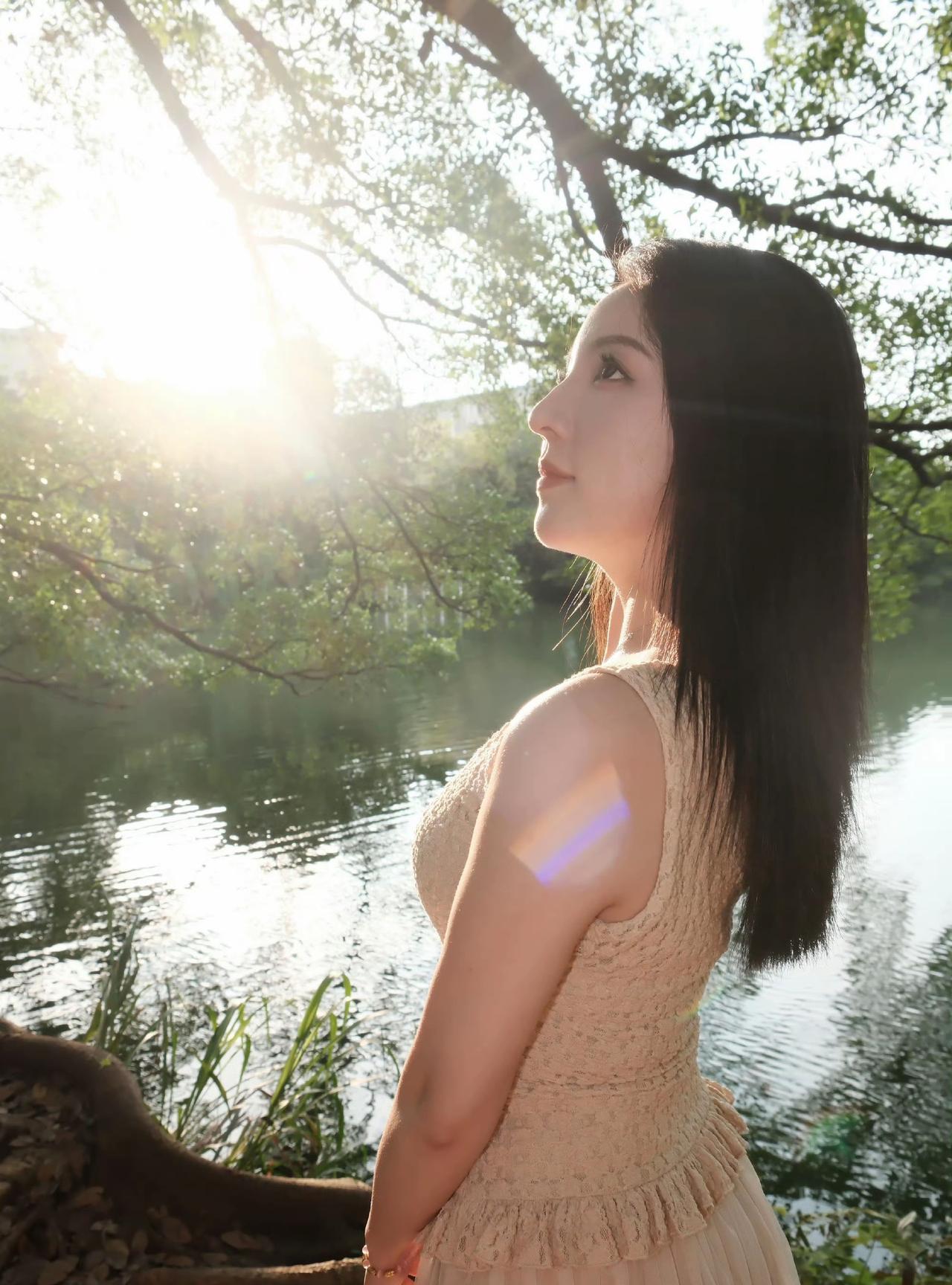 阳光洒落,静谧湖畔,少女沉思。