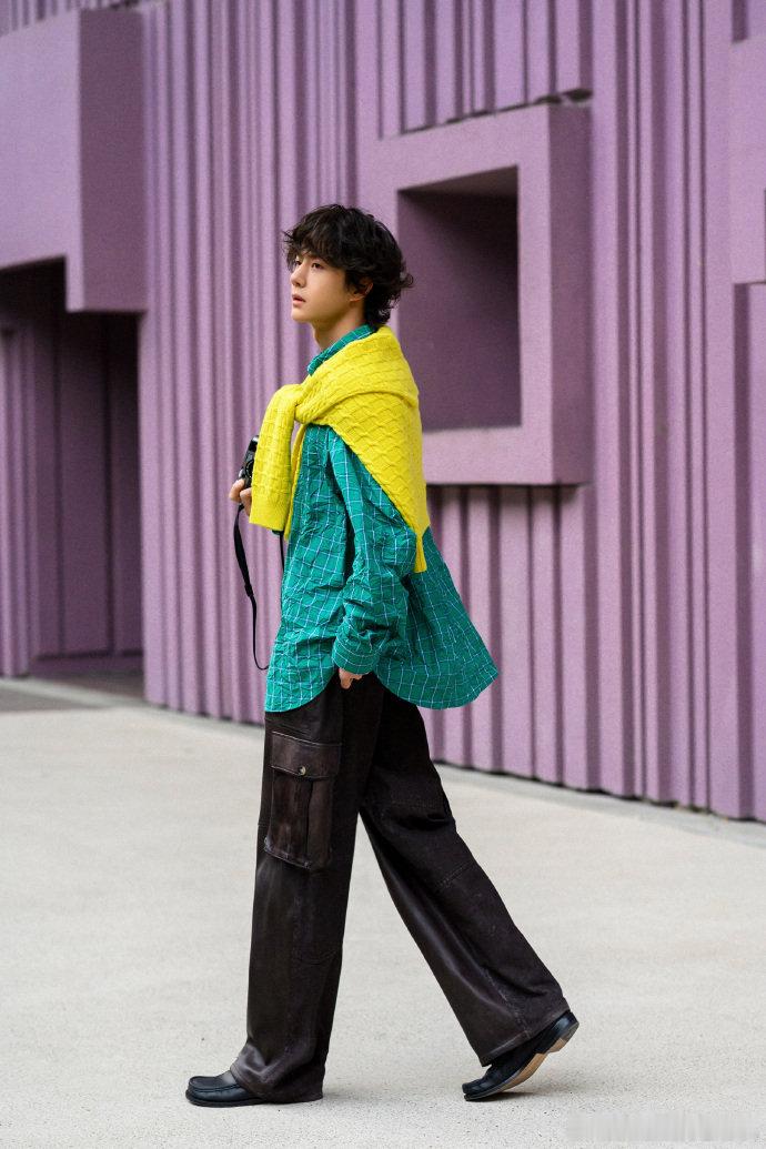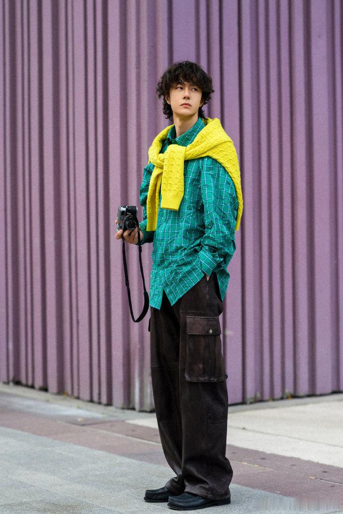 王一博闪现巴黎状态满分,王一博全新风格,谁懂这个卷毛一博搭配绿格纹衬衫黄披肩看秀look,养眼又阳光的运动boy谁能不爱呢~