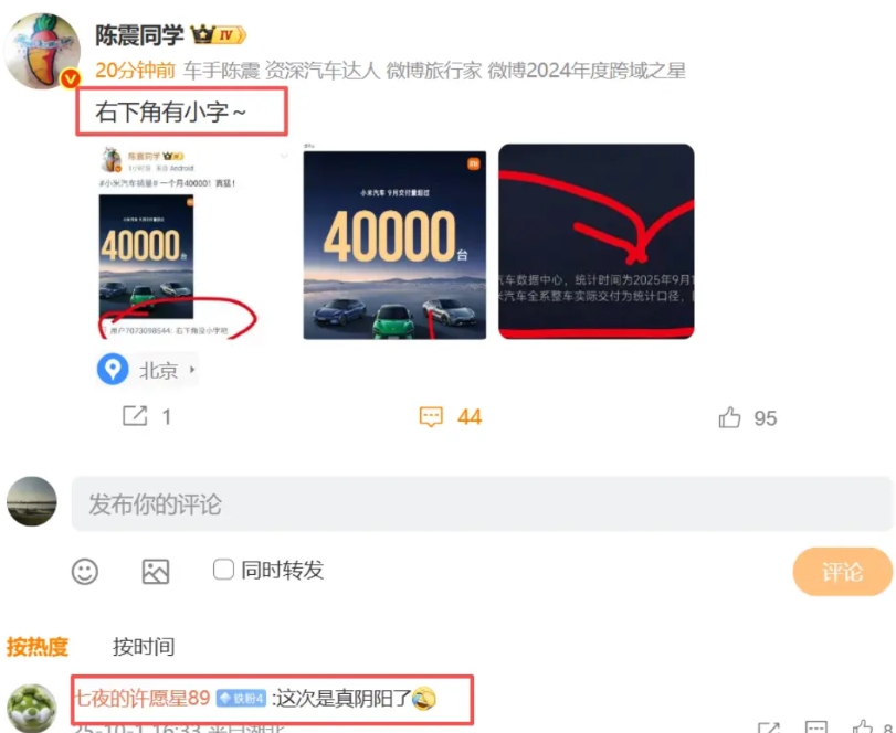 还有几张配图,整体的内容其实就是之前陈震发布了小米汽车9月销量超过40000辆的海报,并且说“真猛”,有人在评论区问了句“有没有小字”,于是陈震放大了海报的小字,回复说有。