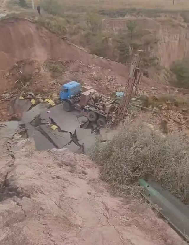 网友拍摄的视频显示:滑坡垮塌区域目测长度超过数十米,宽度几乎覆盖了整个路面,最深处估计有七八米。路面断裂处沥青和水泥层支离破碎,裸露出黄土基层。塌陷坑的边缘极不规则,仍有松动的土块不时滑落。坑底堆积着坍塌下去的路面材料和一些被扯断的护栏碎片。