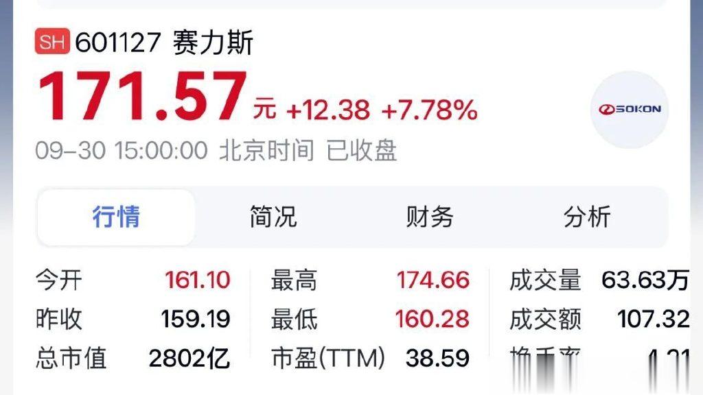 赛力斯股价从2022年的不足30元一路飙升至如今的171.57元(截止北京时间9月30日15点收盘),资本市场正在用真金白银为这种“从合作到共生”的新模式投票。