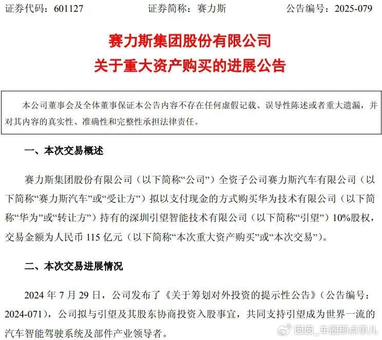 至此,赛力斯汽车收购华为所持深圳引望智能技术有限公司10%股权的交易正式完成,总金额高达115亿元。