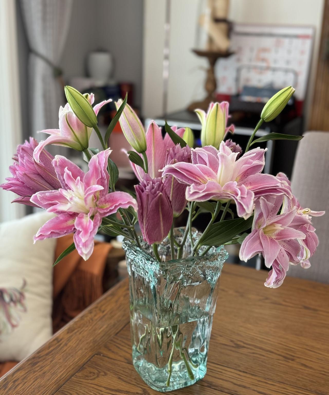 幸亏这个节日够长。 假日三天这么快就过去了,1号2号连吃了四顿,吃的我都不想再吃东西。 叮当和表弟的女儿一般大,今年都考上了大学,为了照顾大家后面还可以安排活动,就假日头两天分别办学子宴。 表弟的女儿虽然没有叮当考的好,但也算不错了。其实哪家的父母都不是全身心得投入和付出,看表弟和弟媳妇喝多了的样子,深感他们的不易,反倒是我家两个更淡定些。最终的结果其实并不那么重要,孩子努力了,家长付出了,足矣。 不过我家不晓得从啥时起请客都吃两顿了,平时一家请客还好,这次俩家一起,连吃四顿真的是够够的。还不是钱的问题,主要是太浪费了,也对身体没好处,但家里老的喜欢,我们小的也只能这样了。 每次下午老的自己去找节目,我们晚辈就去咖啡馆泡着,一桌掼蛋、一桌聊天、几个小孩各自打游戏。大家族就这点好,打个牌也不缺人,打牌比吃饭有意思多了。 今天在爸妈家窝着,一早我还没起床就听到他俩斗嘴,我家这边离菜场远,每次都要给我带菜。其实盒马叮咚,就没有不方便一说。但我现在也随便他们,我说要吃毛豆,爸爸买好了还帮我剥好了,麻麻就埋怨他说剥好了不新鲜。就为了毛豆剥还是不剥,能叨叨半天。听着他们斗嘴,我其实内心满满的幸福,老来伴不就是这样,家不就是这样,叨叨的是幸福。 节日怎么能没有花,回家看到百合盛开了,幸亏走时网兜没扒了,还能坚持几日,酸浆果变干花了。