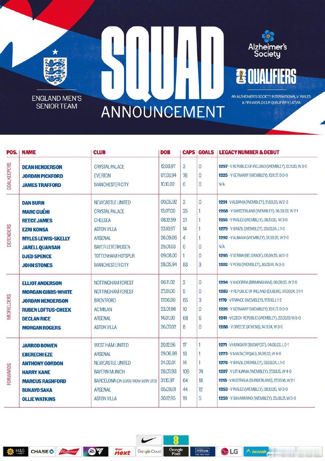 【官方】英格兰队公布最新一期大名单,皇马的贝林厄姆,曼城的福登,水晶宫的沃顿和埃弗顿的格拉利什均没有入选。
