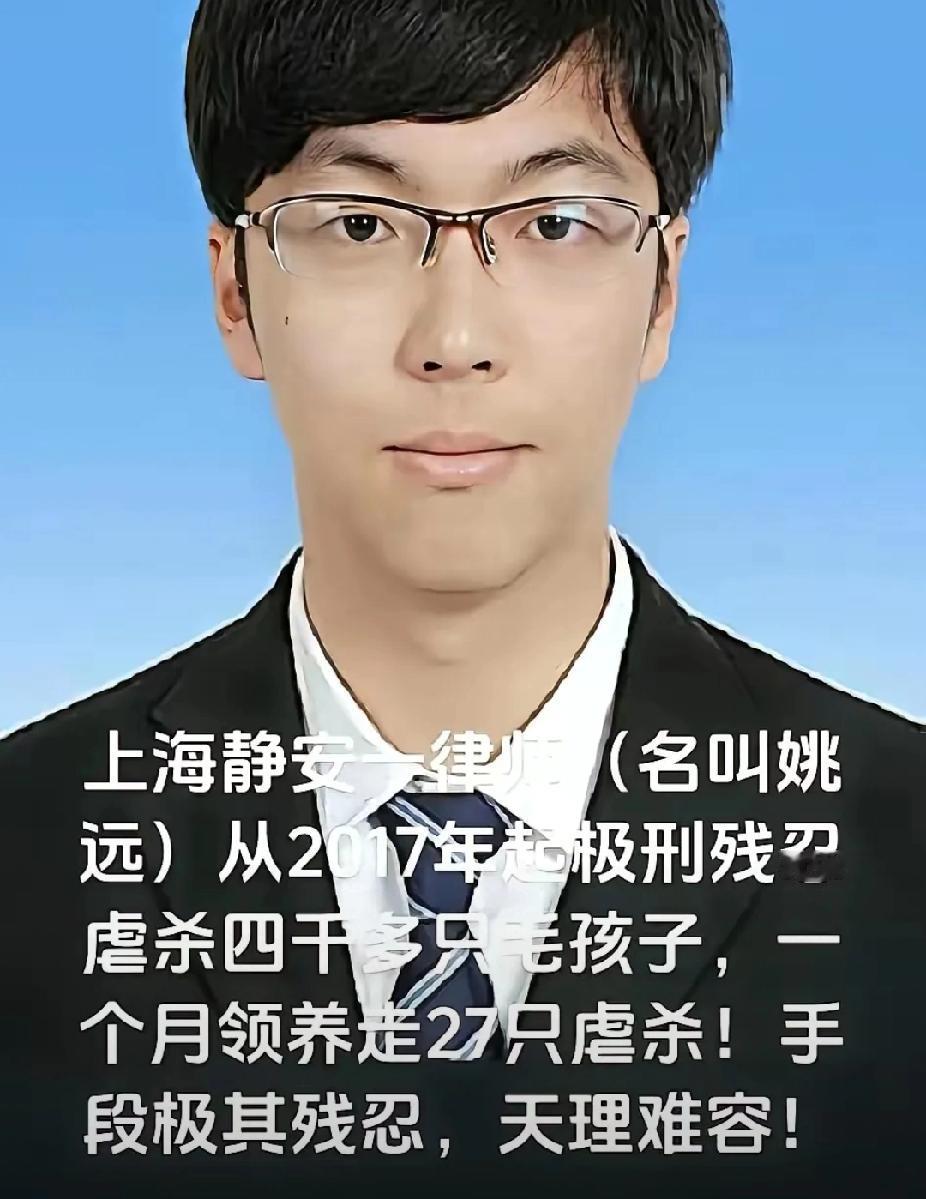 果然人不可貌相!实在是太变态了! 姚远,表面上是一名年轻有为的律师,文质彬彬,谈吐不凡,实则不然,这是一头披着人皮的禽兽。 自2017年起至今,姚远虐杀了4000多只猫,拍摄视频上传到外网,以此赚钱。 国庆节前夕,姚远被上海某律师事务所开除,真是罪有应得,坏事做绝,下场都不会太好! 这几天扫黑除恶专项斗争的通告里,姚远的名字赫然在列,这说明他做的这些事早就被发现了,只不过缺乏证据而已。 这么多年来,他是藏污纳垢,还是继续虐杀猫咪?其实早就该抓住他绳之以法,让他接受法律的制裁。 不过这家伙能逃脱法律制裁,也是有原因的,他父亲是原沈阳军区副参谋长,背景深厚。 可是老天不会放过任何一个罪犯,这家伙的父亲已去世,这么多年积德行善都没有做一点,等于为他种下了恶因。 这个逆子,非但没有光宗耀祖,反而给家里抹黑,造孽太多。 这么变态的人,终于让他接受法律应有的制裁了!真是大快人心! 虐猫者姚远 姚远爸爸
