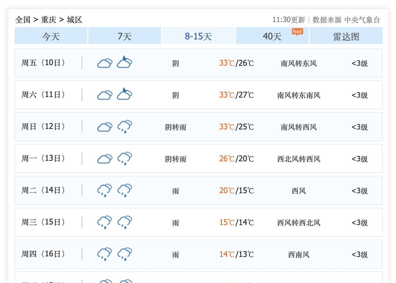 啊啊啊!10月5日到11日,重庆主城区,不下雨,最高气温34度甚至35度,闷热的