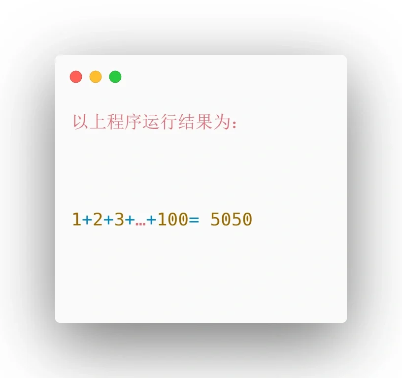 Python小项目[一R][一R][二R] ~ [一R]要求 采用while语句计算1至100的和。 ~ [二R]程序分析 程序的关键在于循环的条件不要找错,不然可能会多一次循环或者少一次循环,也就意味着要么多加了101,要么只加到99,每一次循环循环变量n的值都需要加1,执行下一次循环继续求和,不然会陷入死循环。 ~