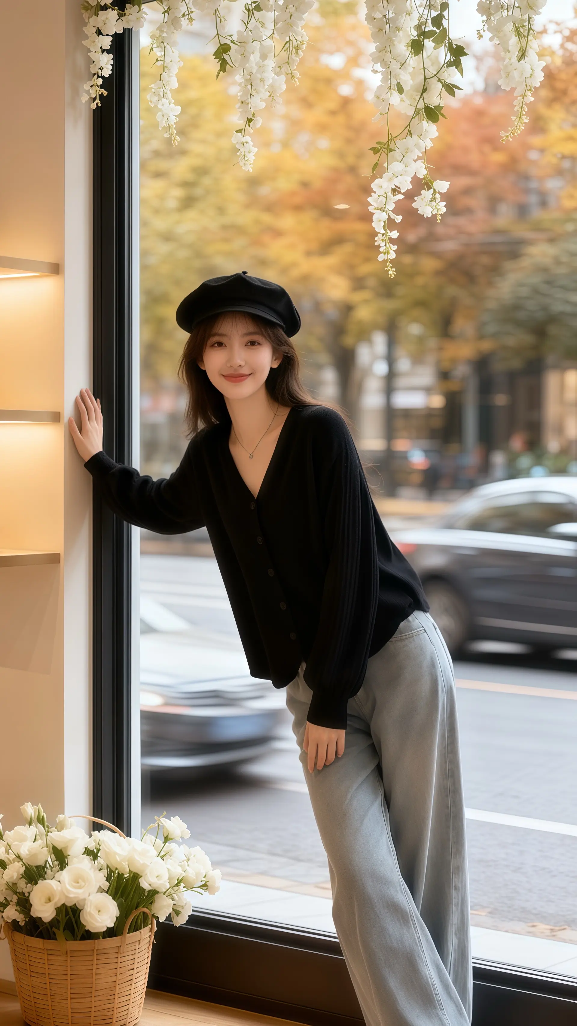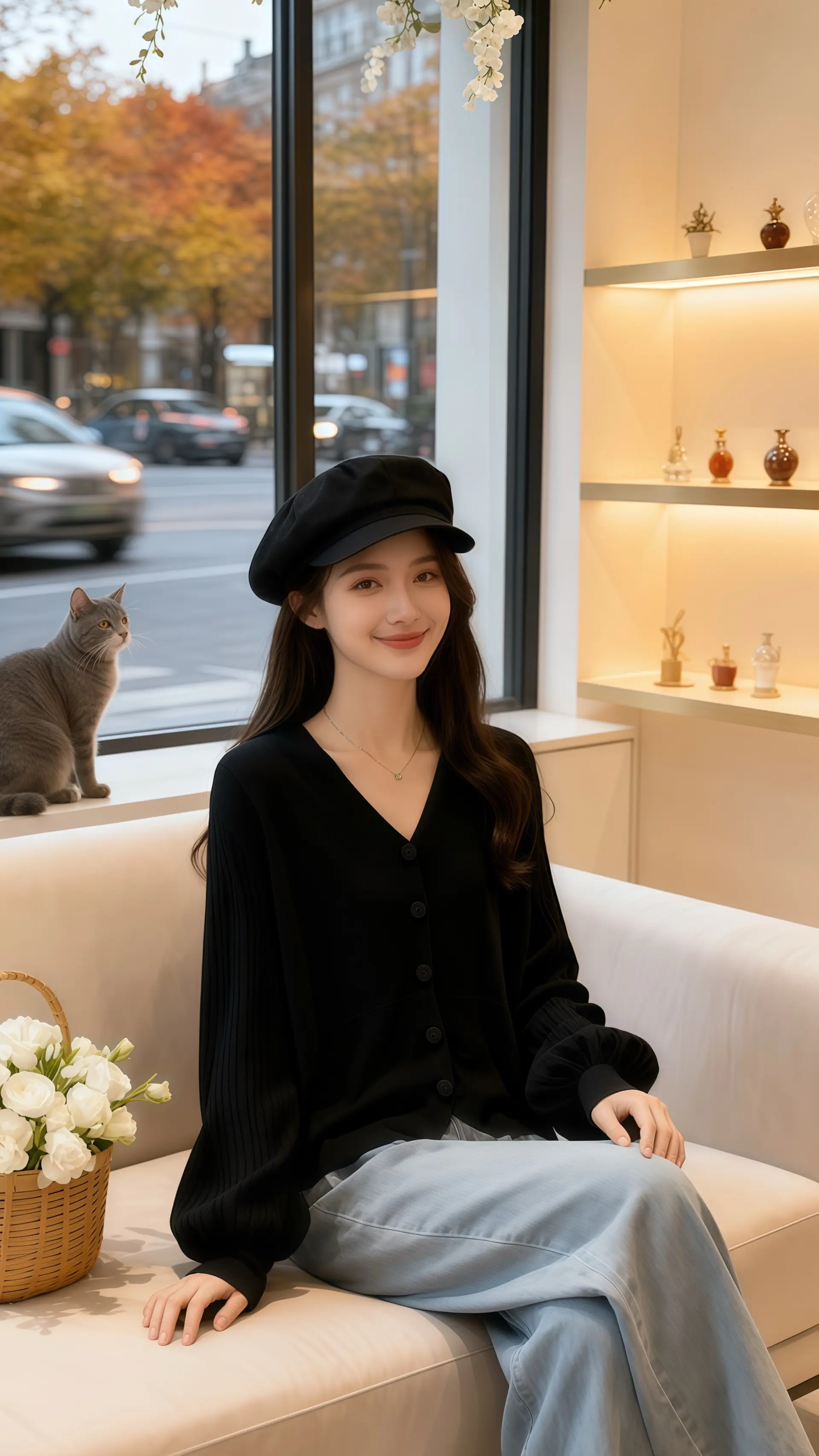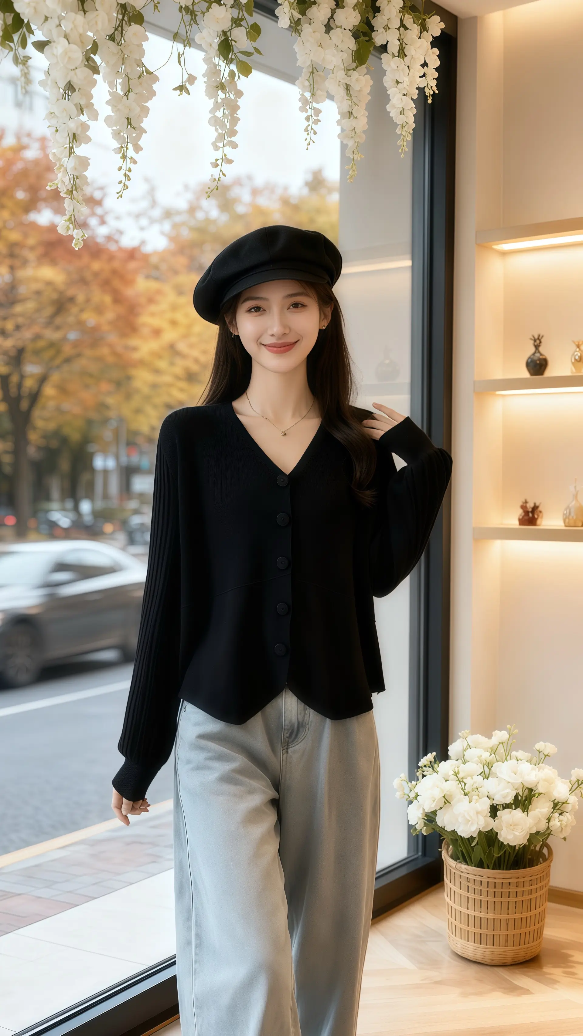 她穿着V领设计感针织开衫,柔软的毛线勾勒出优雅的脖颈线条,独特的剪裁带着几分随性与精致。窗外,秋雨如丝,朦胧地笼罩着整个世界,树叶被雨水浸润得愈发斑斓,在风中轻轻摇曳。雨滴顺着玻璃缓缓滑落,模糊了远处的街道与行人。她倚在窗边,任微凉的风拂过发梢,指尖轻轻摩挲着针织的纹理,时光仿佛在此刻慢了下来,秋日的浪漫与温柔,都藏在了这件针织开衫的褶皱里,也藏在了这一片如烟如雾的雨景中。