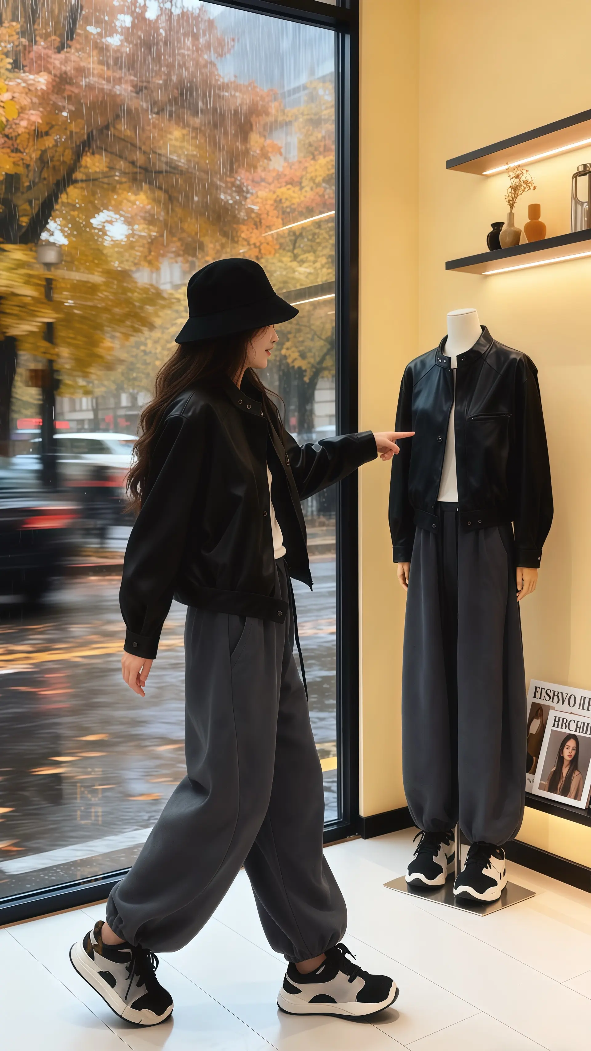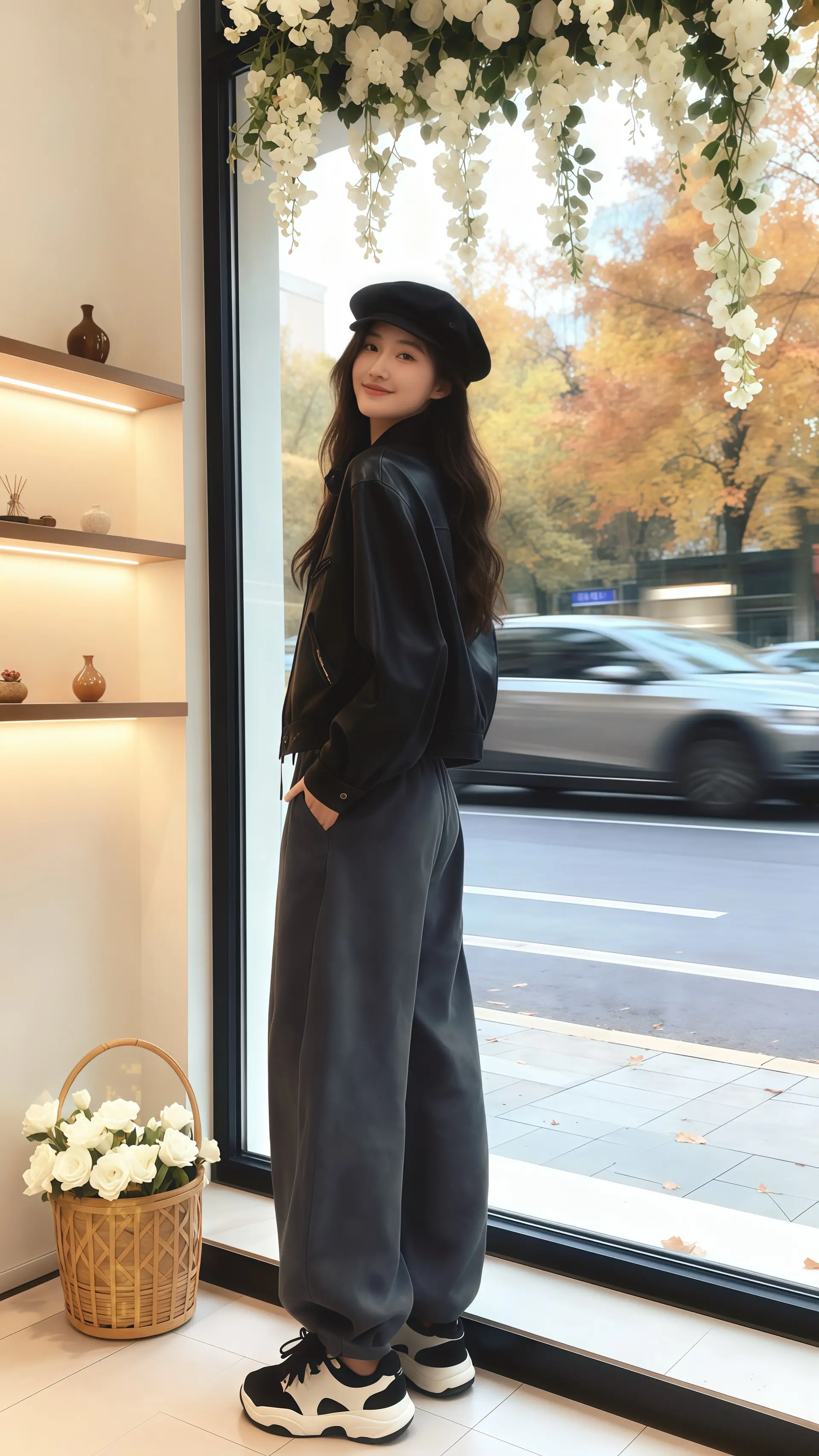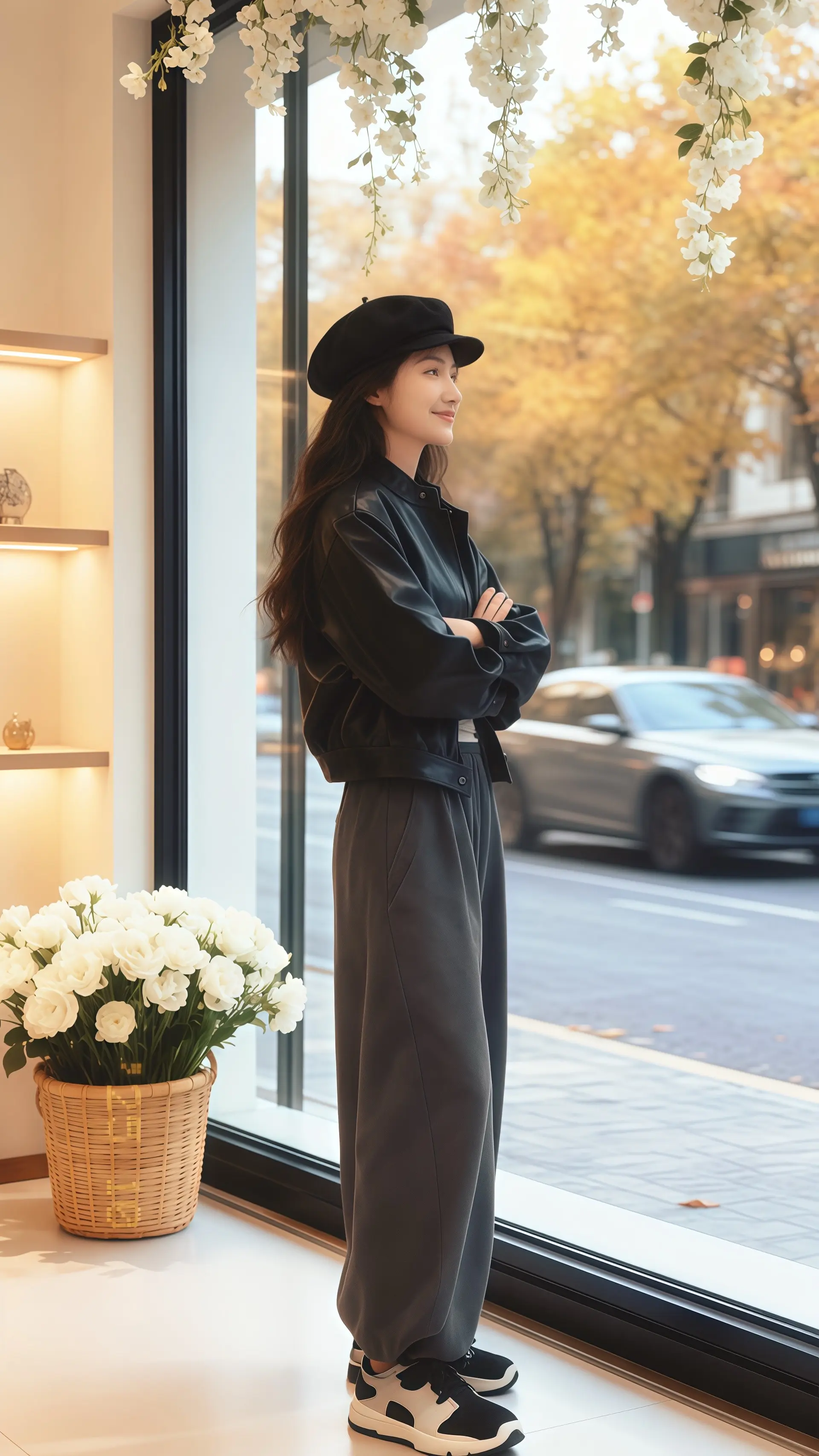 她穿着时尚复古港风休闲两件套,宽松的廓形带着随性慵懒,皮革与软质面料碰撞出独特质感。窗外,秋天正将世界晕染成暖色调,金黄的叶在风里打着旋儿,阳光透过枝叶缝隙洒落,给她周身镀上一层温柔光晕。仿佛时光倒流回那个港风盛行的年代,她便是从旧电影里走出的主角,在这秋日的静谧与浪漫中,自成一道复古又鲜活的风景。