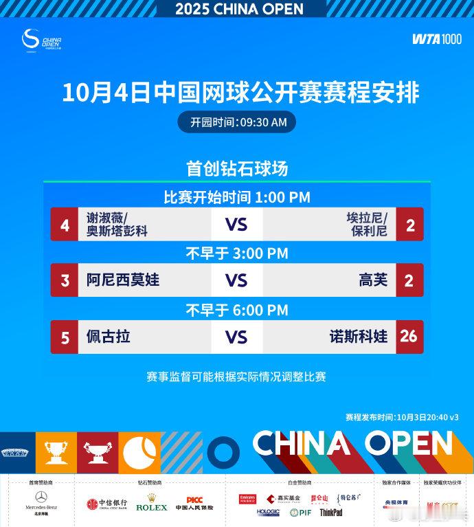 不早于15:00 女单半决赛 阿尼西莫娃vs高芙