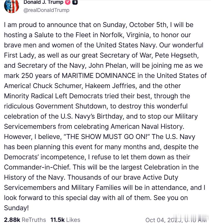 查克·舒默、哈基姆·杰弗里斯以及其他少数派激进左派民左党人,试图通过荒谬的政府关门行动破坏这一美好的美国海军生日庆典,阻止我们的军人庆祝美国海军历史。然而,我相信:“演出必须继续!”美国海军为这次活动筹备已久,尽管民左党的无能,我作为他们的总司令,绝不让他们失望。