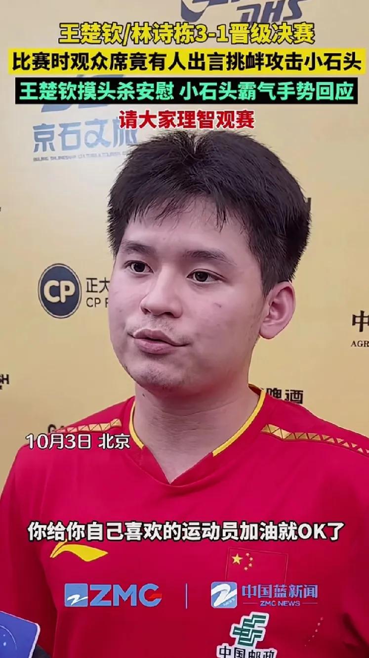 小石头真的太难了! 小石头在赛后采访时说到:你给你自己喜欢运动员加油就OK,不要去干扰到其它运动,也希望大家可以理智一下。 说真的我昨天看到大头和小时候在打比赛的时候现场突然冒出来一个女的声音,不知道是“醒醒”还是“行不行”我没有听说,到底说的是啥 然而还看到了小石头朝着观众席位比个不好的手势 还有网友说小石头不礼貌,再怎么的也不能朝自己的球迷做这个不雅的手势, 我觉得啥人啥对打,对待这样的饭团化就应该大胆的回击,我觉得小石头做的对,是她小出言不逊,对人不礼貌的, 她对咱们都不礼貌干嘛要对她礼貌呢?